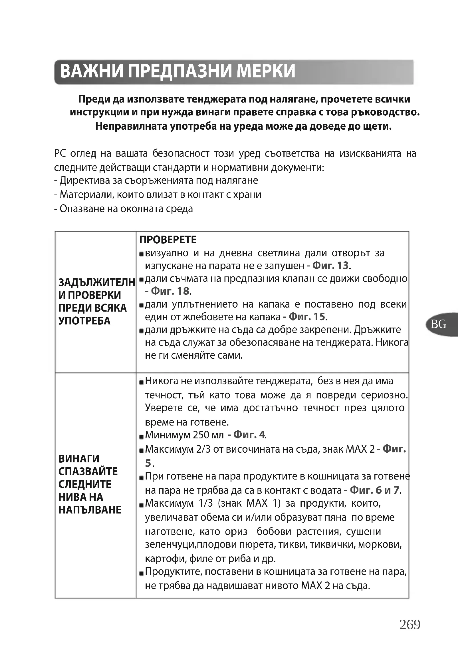 Преди да използвате тенджерата под налягане, прочетете всички инструкции и при нужда винаги правете справка с това ръководство. Неправилната употреба на уреда може да доведе до щети. PС оглед на вашата безопасност този уред съответства на изискванията на следните действащи стандарти и нормативни документи: - Директива за съоръженията под налягане - Материали, които влизат в контакт с храни - Опазване на околната среда ВАЖНИ ПРЕДПАЗНИ МЕРКИ ЗАДЪЛЖИТЕЛН