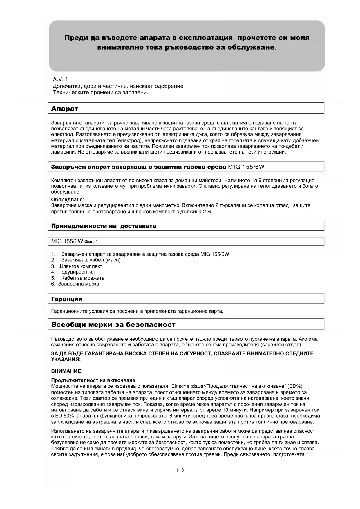 Продължителност на включване Мощността на апарата се изразява с показателя „Einschaltdauer/Продължителнаст на включване“ (ED%) поместен на типовата табелка на апарата, тоест отношението между времето за заваряване и времето за охлаждане. Този фактор се променя при един и същ апарат според условията на натоварване, което значи според изразходвания заваръчен ток. Показва, колко време може апаратът с посочения заваръчен ток на натоварване да работи и се отнася винаги спрямо интервала от време 10 минути. Например при заваръчен ток с ED 60% апаратът функционира непрекъснато 6 минути, след това време настъпва празна фаза, необходима за охлаждане на вътрешната част, и след което отново се включва защитата против топлинно претоварване. Използването на заваръчните апарати и извършването на заваръчни работи може да представлява опасност както за лицето, което с апарата борави, така и за други. Затова лицето обслужващо апарата трябва безусловно не само да прочете мерките за безопасност, които тук са поместени, но трябва да ги знае и спазва. Трябва да се има винаги в предвид, че блогоразумно, добре запознато обслужващо лице, което точно спазва своите задължения, е това най-доброто обезопасяване против травми. Преди свързването, подготовката, Преди да въведете апарата в експлоатация, прочетете си моля внимателно това ръководство за обслужване. A.V. 1 Допечатки, дори и частични, изискват одобрение. Техническите промени са запазени. 113използването или транспорта на апарата би трябвало да си прочетете указанията поместени в настоящият текст и да се ръководите според тях. ИНСТАЛАЦИЯ НА АПАРАТА