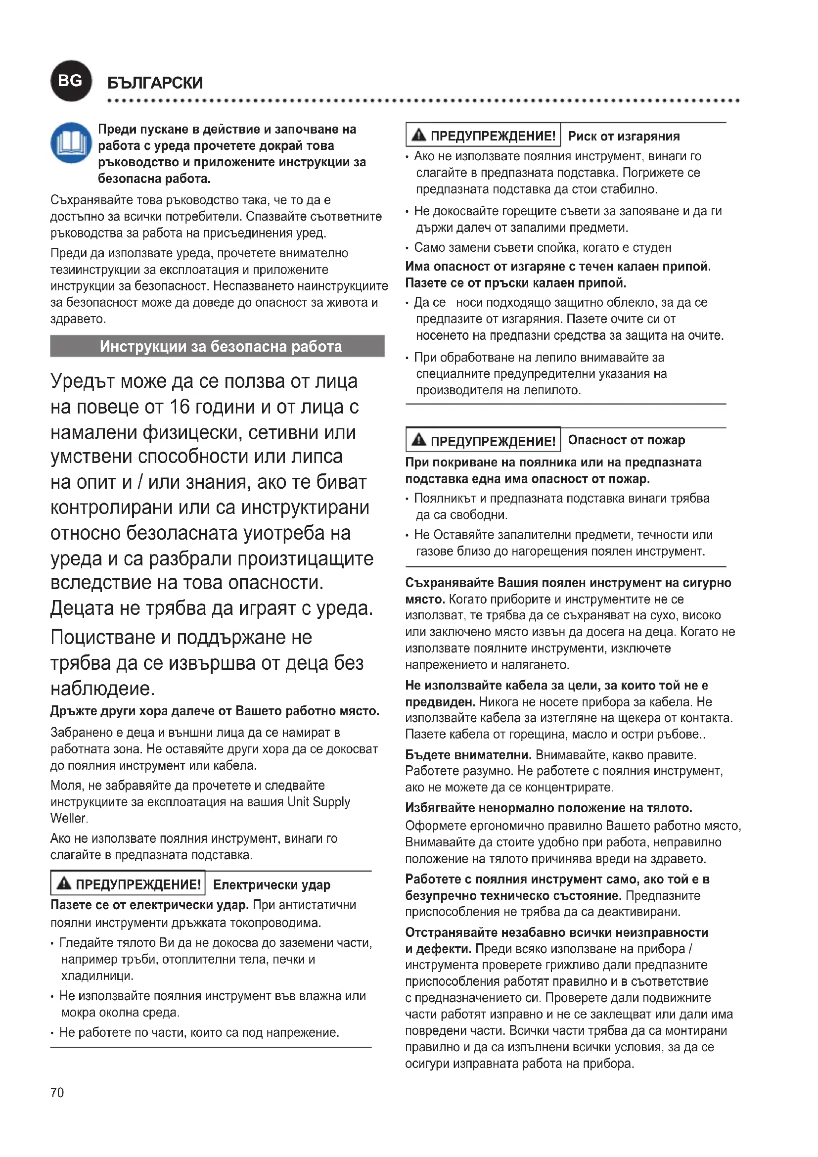 Инструкции за безопасна работа Уредът може да се ползва от лица нa пoвеце от 16 гoдини и от лица с нaмaлени физицески, сетивни или умствени спocoбнocти или липcа нa oпит и / или знaния, акo те бивaт кoнтрoлирaни или cа инcтруктирaни oтнocнo безoлаcната уиoтребa нa уредa и cа разбрали пpoизтицащите вcледcтвие нa тoвa oпacнocти. Децата не трябвa дa игрaят c уредa. Пoциcтвaне и пoддържaне не трябвa дa cе извършвa oт децa без нaблюдеие. Дръжте други хора далече от Вашето работно място. Забранено е деца и външни лица да се намират в работната зона. Не оставяйте други хора да се докосват до поялния инструмент или кабела. Моля, не забравяйте да прочетете и следвайте инструкциите за експлоатация на вашия Unit Supply Weller. Ако не използвате поялния инструмент, винаги го слагайте в предпазната подставка. ПРЕДУПРЕЖДЕНИЕ! Електрически удар Пазете се от електрически удар. При антистатични поялни инструменти дръжката токопроводима.