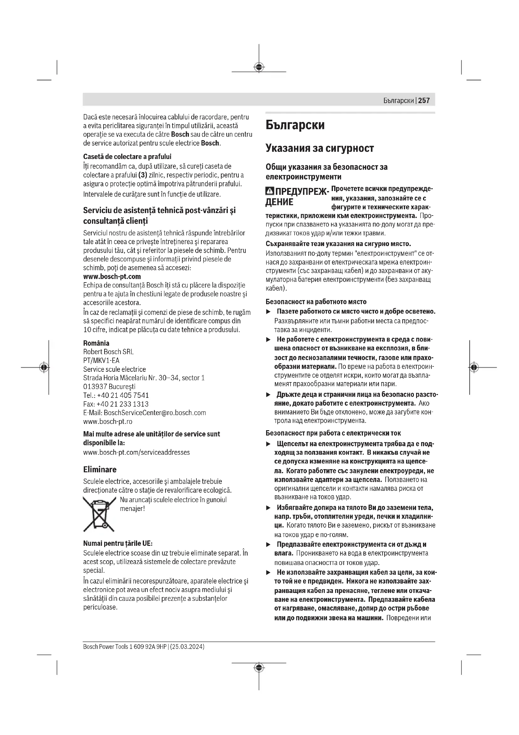 Безопасност на работното място u Пазете работното си място чисто и добре осветено. Разхвърляните или тъмни работни места са предпос- тавка за инциденти. u Не работете с електроинструмента в среда с пови- шена опасност от възникване на експлозия, в бли- зост до леснозапалими течности, газове или прахо- образни материали. По време на работа в електроин- струментите се отделят искри, които могат да възпла- менят прахообразни материали или пари. u Дръжте деца и странични лица на безопасно разсто- яние, докато работите с електроинструмента. Ако вниманието Ви бъде отклонено, може да загубите кон- трола над електроинструмента. Безопасност при работа с електрически ток u Щепселът на електроинструмента трябва да е под- ходящ за ползвания контакт. В никакъв случай не се допуска изменяне на конструкцията на щепсе- ла. Когато работите със занулени електроуреди, не използвайте адаптери за щепсела. Ползването на оригинални щепсели и контакти намалява риска от възникване на токов удар. u Избягвайте допира на тялото Ви до заземени тела, напр. тръби, отоплителни уреди, печки и хладилни- ци. Когато тялото Ви е заземено, рискът от възникване на токов удар е по‑голям. u Предпазвайте електроинструмента си от дъжд и влага. Проникването на вода в електроинструмента повишава опасността от токов удар. u Не използвайте захранващия кабел за цели, за кои- то той не е предвиден. Никога не използвайте зах- ранващия кабел за пренасяне, теглене или откача- ване на електроинструмента. Предпазвайте кабела от нагряване, омасляване, допир до остри ръбове или до подвижни звена на машини. Повредени или Bosch Power Tools 1 609 92A 9HP | (25.03.2024)258 | Български усукани кабели увеличават риска от възникване на то-