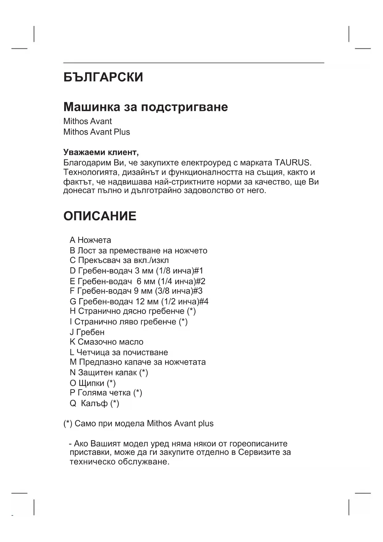 Mithos Avant Plus - тример за брада TAURUS - Безплатно ръководство за потребителя