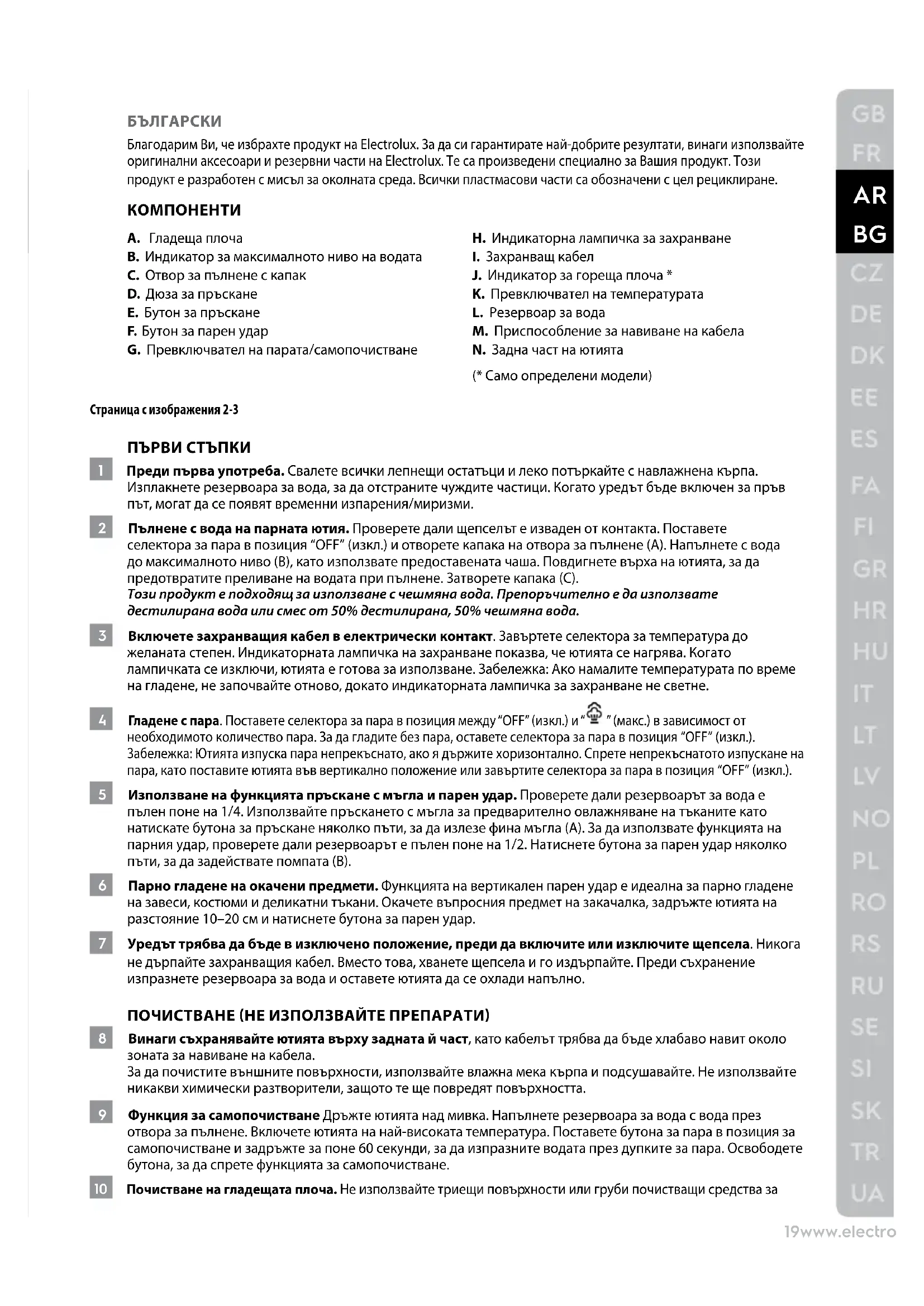 J. Индикатор за гореща плоча * K. Превключвател на температурата L. Резервоар за вода M. Приспособление за навиване на кабела N. Задна част на ютията (* Cамо определени модели) Страница с изображения 2-3 ПЪРВИ СТЪПКИ 1 Преди първа употреба. Свалете всички лепнещи остатъци и леко потъркайте с навлажнена кърпа. Изплакнете резервоара за вода, за да отстраните чуждите частици. Когато уредът бъде включен за пръв път, могат да се появят временни изпарения/миризми. 2 Пълнене с вода на парната ютия. Проверете дали щепселът е изваден от контакта. Поставете селектора за пара в позиция “OFF” (изкл.) и отворете капака на отвора за пълнене (A). Напълнете с вода до максималното ниво (B), като използвате предоставената чаша. Повдигнете върха на ютията, за да предотвратите преливане на водата при пълнене. Затворете капака (C). Този продукт е подходящ за използване с чешмяна вода. Препоръчително е да използвате дестилирана вода или смес от 50% дестилирана, 50% чешмяна вода. 3 Включете захранващия кабел в електрически контакт. Завъртете селектора за температура до желаната степен. Индикаторната лампичка на захранване показва, че ютията се нагрява. Когато лампичката се изключи, ютията е готова за използване. Забележка: Ако намалите температурата по време на гладене, не започвайте отново, докато индикаторната лампичка за захранване не светне. 4 Гладене с пара. Поставете селектора за пара в позиция между “OFF” (изкл.) и “ ” (макс.) в зависимост от необходимото количество пара. За да гладите без пара, оставете селектора за пара в позиция “OFF” (изкл.). Забележка: Ютията изпуска пара непрекъснато, ако я държите хоризонтално. Спрете непрекъснатото изпускане на пара, като поставите ютията във вертикално положение или завъртите селектора за пара в позиция “OFF” (изкл.). 5 Използване на функцията пръскане с мъгла и парен удар. Проверете дали резервоарът за вода е пълен поне на 1/4. Използвайте пръскането с мъгла за предварително овлажняване на тъканите като натискате бутона за пръскане няколко пъти, за да излезе фина мъгла (A). За да използвате функцията на парния удар, проверете дали резервоарът е пълен поне на 1/2. Натиснете бутона за парен удар няколко пъти, за да задействате помпата (B). 6 Парно гладене на окачени предмети. Функцията на вертикален парен удар е идеална за парно гладене на завеси, костюми и деликатни тъкани. Окачете въпросния предмет на закачалка, задръжте ютията на разстояние 10–20 см и натиснете бутона за парен удар. 7 Уредът трябва да бъде в изключено положение, преди да включите или изключите щепсела. Никога не дърпайте захранващия кабел. Вместо това, хванете щепсела и го издърпайте. Преди съхранение изпразнете резервоара за вода и оставете ютията да се охлади напълно. ПОЧИСТВАНЕ (НЕ ИЗПОЛЗВАЙТЕ ПРЕПАРАТИ) 8 Винаги съхранявайте ютията върху задната й част, като кабелът трябва да бъде хлабаво навит около зоната за навиване на кабела. За да почистите външните повърхности, използвайте влажна мека кърпа и подсушавайте. Не използвайте никакви химически разтворители, защото те ще повредят повърхността. 9 Функция за самопочистване Дръжте ютията над мивка. Напълнете резервоара за вода с вода през отвора за пълнене. Включете ютията на най-високата температура. Поставете бутона за пара в позиция за самопочистване и задръжте за поне 60 секунди, за да изпразните водата през дуп