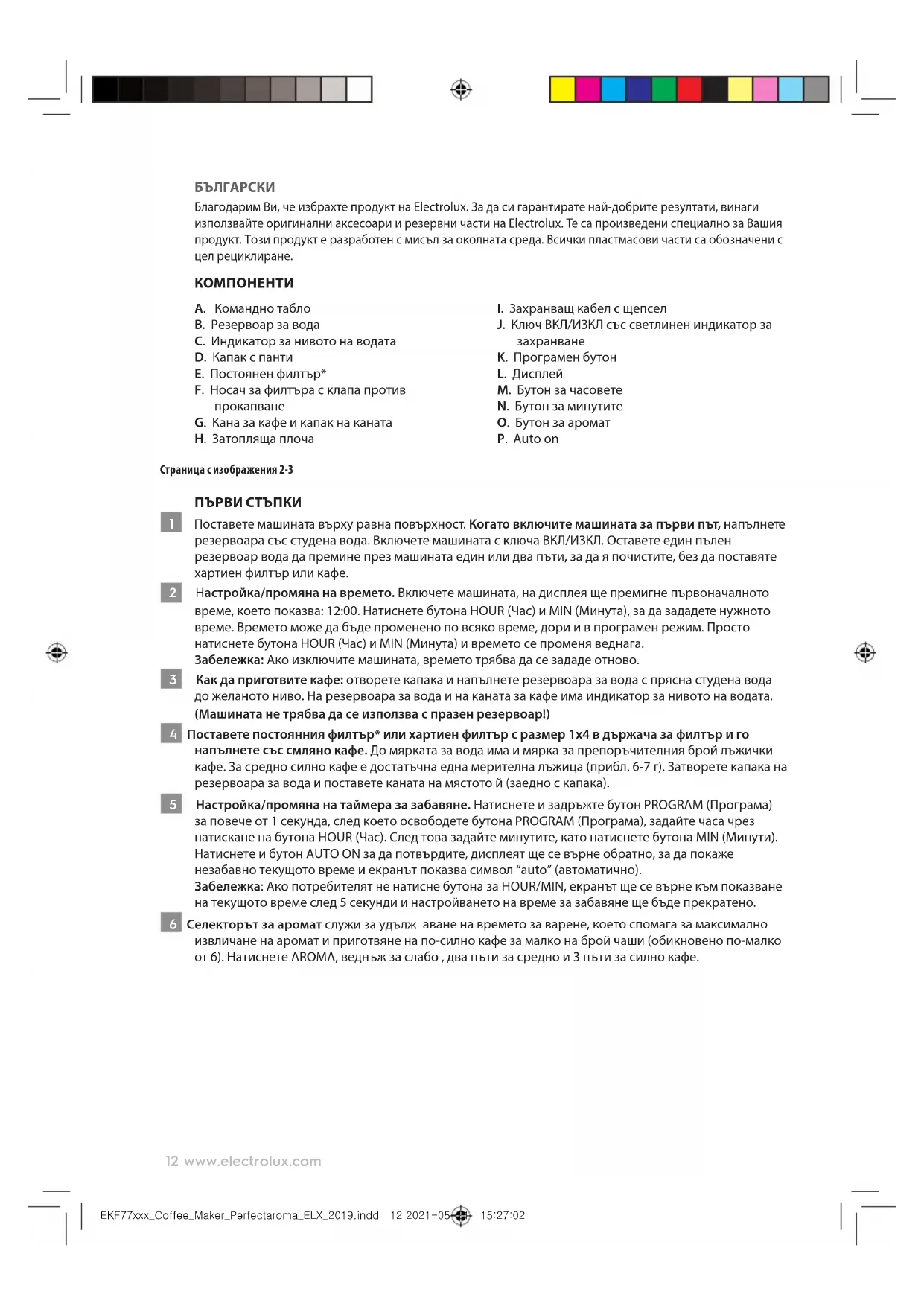 K. Програмен бутон L. Дисплей M. Бутон за часовете N. Бутон за минутите O. Бутон за аромат P. Auto on Страница с изображения 2-3 ПЪРВИ СТЪПКИ 1 Поставете машината върху равна повърхност. Когато включите машината за първи път, напълнете резервоара със студена вода. Включете машината с ключа ВКЛ/ИЗКЛ. Оставете един пълен резервоар вода да премине през машината един или два пъти, за да я почистите, без да поставяте хартиен филтър или кафе. 2 Настройка/промяна на времето. Включете машината, на дисплея ще премигне първоначалното време, което показва: 12:00. Натиснете бутона HOUR (Час) и MIN (Минута), за да зададете нужното време. Времето може да бъде променено по всяко време, дори и в програмен режим. Просто натиснете бутона HOUR (Час) и MIN (Минута) и времето се променя веднага. Забележка: Ако изключите машината, времето трябва да се зададе отново. 3 Как да приготвите кафе: отворете капака и напълнете резервоара за вода с прясна студена вода до желаното ниво. На резервоара за вода и на каната за кафе има индикатор за нивото на водата. (Машината не трябва да се използва с празен резервоар!) 4 Поставете постоянния филтър* или хартиен филтър с размер 1x4 в държача за филтър и го напълнете със с мляно кафе. До мярката за вода има и мярка за препоръчителния брой лъжички кафе. За средно силно кафе е достатъчна една мерителна лъжица (прибл. 6-7 г). Затворете капака на резервоара за вода и поставете каната на мястото й (заедно с капака). 5 Настройка/промяна на таймера за забавяне. Натиснете и задръжте бутон PROGRAM (Програма) за повече от 1 секунда, след което освободете бутона PROGRAM (Програма), задайте часа чрез натискане на бутона HOUR (Час). След това задайте минутите, като натиснете бутона MIN (Минути). Натиснете и бутон AUTO ON за да потвърдите, дисплеят ще се върне обратно, за да покаже незабавно текущото време и екранът показва символ “auto” (автоматично). Забележка: Ако потребителят не натисне бутона за HOUR/MIN, екранът ще се върне към показване на текущото време след 5 секунди и настройването на време за забавяне ще бъде прекратено. 6 Селекторът за аромат служи за удълж аване на времето за варене, което спомага за максимално извличане на аромат и приготвяне на по-силно кафе за малко на брой чаши (обикновено по-малко от 6). Натиснете AROMA, веднъж за слабо , два пъти за средно и 3 пъти за силно кафе. EKF77xxx_Coffee_Maker_Perfectaroma_ELX_2019.indd 12 2021-05-21 15:27:0213www.electrolux.com