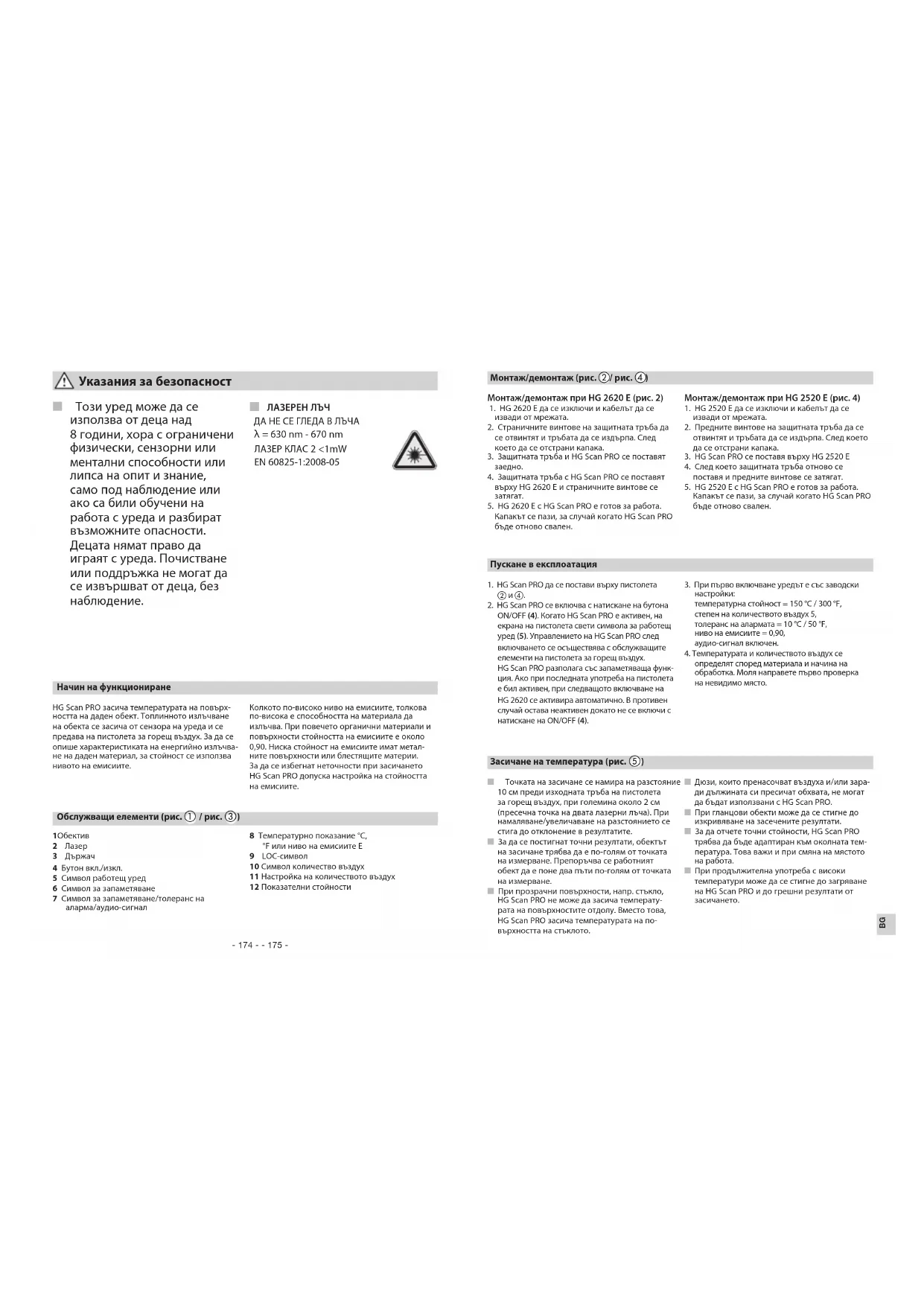 - Точността е при около 25°C околна температура и спазване на оптималното разстояние към обекта. Технически данни HG Scan PRO 2620 E HG Scan PRO2520 E Почистване на обектива: При замърсяване, обективът може да бъде по- чистен с влажна, мека кърпа (без почистващ пре- парат). Като алтернатива може да се използва течност за почистване на обективи. Не могат да се използват никакви разтворители, нито такива, съдържащи киселина или алкохол. Почистване на корпуса Корпусът може да се почиства с вода или нежен почистващ препарат. Не могат да се използват никакви разтворители. Грижа и поддръжкаНиво на емисии Този продукт на STEINEL е произведен с най-го- лямо старание, проверен е за функционалност и безопасност, според действащите разпоредби, след което е подложен на качествен контрол, на принципа на случайния избор. STEINEL гаранти- ра перфектна изработка и функции. Гаранцията е с продължителност 12 месеца и започва от деня на покупката. Ние отстраняваме всички дефекти, причинени от грешки в производство- то или качеството на материала, ремонтирайки или заменяйки дефектните части, по наш избор. Гаранцията не важи за щети по износващи се части, за щети и дефекти, получени в резултат на неправилна употреба или поддръжка, както и за счупване при падане. Последващи щети на чужди предмети са изключени от гаранцията. Гаранцията е валидна само, ако неразглобеният уред бъде изпратен на съответния сервиз, добре опакован и придружен от кратко опи- сание на дефекта, касова бележка или фактура (дата на покупка и печат на търговец), или бъде предаден на търговеца в първите 6 месеца. Ремонтен сервиз: След изтичане на гаранцията или при дефекти, непокрити от гаранцията, моля попитайте в най-близкия заводски сервиз за възможностите