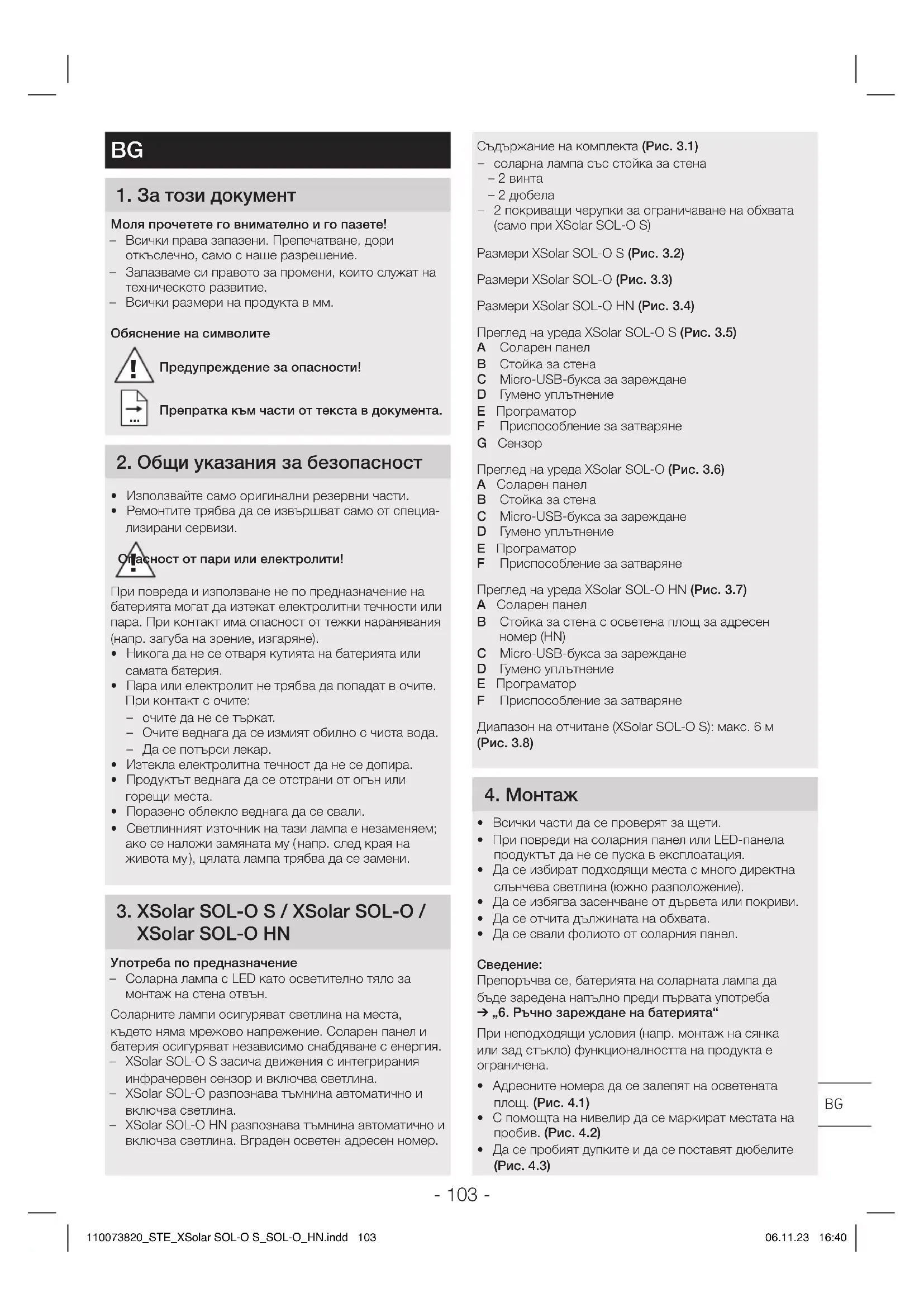 ■ Мястото на монтаж да се провери (повече директна слънчева светлина) Опасност от щети при липса на употреба ■ Когато лампата не се използва дълго време (напр. складиране), батерията може да бъде окончателно повредена поради дълбоко разреждане ■ Програматорът да се постави на P0 съответно OFF ■ Батерията да се зареди напълно преди сваляне от употреба ■ Батерията да се зарежда редовно при липса на употреба 11 Проблеми при експлоатация 110073820_STE_XSolar SOL-O S_SOL-O_HN.indd 106110073820_STE_XSolar SOL-O S_SOL-O_HN.indd 106 06.11.23 16:4006.11.23 16:40- 107 - XSolar SOL-O HN 产品尺寸(图 3.4)XSolar SOL-O S 设备概况 (图 3.5)A A太阳能板B B墙壁支架C CMicro-USB充电插口D D橡胶密封件E E程序选择开关F F摄像头G G传感器单元XSolar SOL-O 设备概况 (图 3.6)A A太阳能板B B墙壁支架C CMicro-USB充电插口D D橡胶密封件E E程序选择开关F F摄像头XSolar SOL-O HN 设备概况 (图 3.7)A A太阳能板B B带门牌号码(HN)照明区域的壁挂支架C CMicro-USB充电插口D D橡胶密封件E E程序选择开关F F摄像头检测区范围 (XSolar SOL-O S): 最大 6 m (图 3.8)