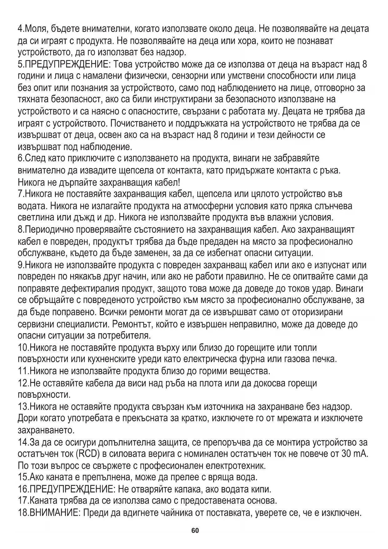 Гаранционните условия са различни, ако устройството се използва с търговска цел." (BG) БЪЛГАРСКИ60 8.Периодично проверявайте състоянието на захранващия кабел. Ако захранващият кабел е повреден, продуктът трябва да бъде предаден на място за професионално обслужване, където да бъде заменен, за да се избегнат опасни ситуации. 12.Не оставяйте кабела да виси над ръба на плота или да докосва горещи повърхности. 10.Никога не поставяйте продукта върху или близо до горещите или топли повърхности или кухненските уреди като електрическа фурна или газова печка. 6.След като приключите с използването на продукта, винаги не забравяйте внимателно да извадите щепсела от контакта, като придържате контакта с ръка. Никога не дърпайте захранващия кабел! 13.Никога не оставяйте продукта свързан към източника на захранване без надзор. Дори когато употребата е прекъсната за кратко, изключете го от мрежата и изключете захранването. 4.Моля, бъдете внимателни, когато използвате около деца. Не позволявайте на децата да си играят с продукта. Не позволявайте на деца или хора, които не познават устройството, да го използват без надзор. 14.За да се осигури допълнителна защита, се препоръчва да се монтира устройство за остатъчен ток (RCD) в силовата верига с номинален остатъчен ток не повече от 30 mA. По този въпрос се свържете с професионален електротехник. 5.ПРЕДУПРЕЖДЕНИЕ: Това устройство може да се използва от деца на възраст над 8 години и лица с намалени физически, сензорни или умствени способности или лица без опит или познания за устройството, само под наблюдението на лице, отговорно за тяхната безопасност, ако са били инструктирани за безопасното използване на устройството и са наясно с опасностите, свързани с работата му. Децата не трябва да играят с устройството. Почистването и поддръжката на устройството не трябва да се извършват от деца, освен ако са на възраст над 8 години и тези дейности се извършват под наблюдение. 7.Никога не поставяйте захранващия кабел, щепсела или цялото устройство във водата. Никога не излагайте продукта на атмосферни условия като пряка слънчева светлина или дъжд и др. Никога не използвайте продукта във влажни условия. 9.Никога не използвайте продукта с повреден захранващ кабел или ако е изпуснат или повреден по някакъв друг начин, или ако не работи правилно. Не се опитвайте сами да поправяте дефектиралия продукт, защото това може да доведе до токов удар. Винаги се обръщайте с повреденото устройство към място за професионално обслужване, за да бъде поправено. Всички ремонти могат да се извършват само от оторизирани сервизни специалисти. Ремонтът, който е извършен неправилно, може да доведе до опасни ситуации за потребителя. 11.Никога не използвайте продукта близо до горими вещества. 15.Ако каната е препълнена, може да прелее с вряща вода. 17.Каната трябва да се използва само с предоставената основа. 18.ВНИМАНИЕ: Преди да вдигнете чайника от поставката, уверете се, че е изключен. 16.ПРЕДУПРЕЖДЕНИЕ: Не отваряйте капака, ако водата кипи.61 3.Включете каната в мрежата 220-240V ~ 50/60Hz, натиснете бутона ON / OFF. Индикаторната лампа ще светне.