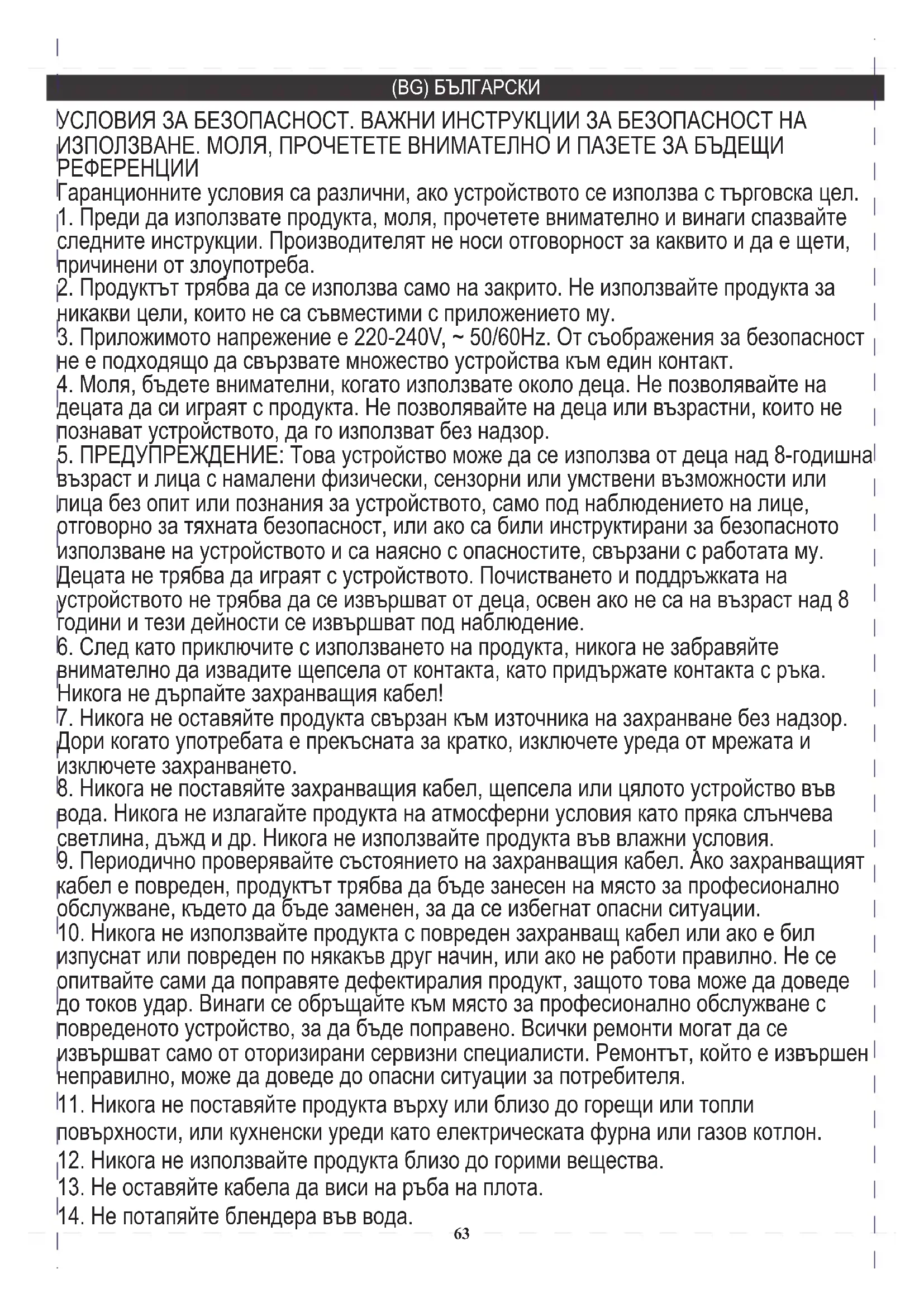 кабел е повреден, продуктът трябва да бъде занесен на място за професионално обслужване, където да бъде заменен, за да се избегнат опасни ситуации. УСЛОВИЯ ЗА БЕЗОПАСНОСТ. ВАЖНИ ИНСТРУКЦИИ ЗА БЕЗОПАСНОСТ НА ИЗПОЛЗВАНЕ. МОЛЯ, ПРОЧЕТЕТЕ ВНИМАТЕЛНО И ПАЗЕТЕ ЗА БЪДЕЩИ