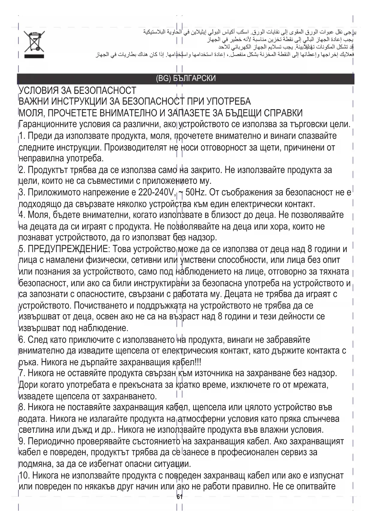 следните инструкции. Производителят не носи отговорност за щети, причинени от неправилна употреба. 61сами да ремонтирате дефектния продукт, защото това може да доведе до токов удар. Винаги обръщайте повреденото устройство в професионален сервиз, за да го поправите. Всички ремонти могат да се извършват само от оторизирани сервизи. Ремонтът, който е извършен неправилно, може да причини опасни ситуации за потребителя.