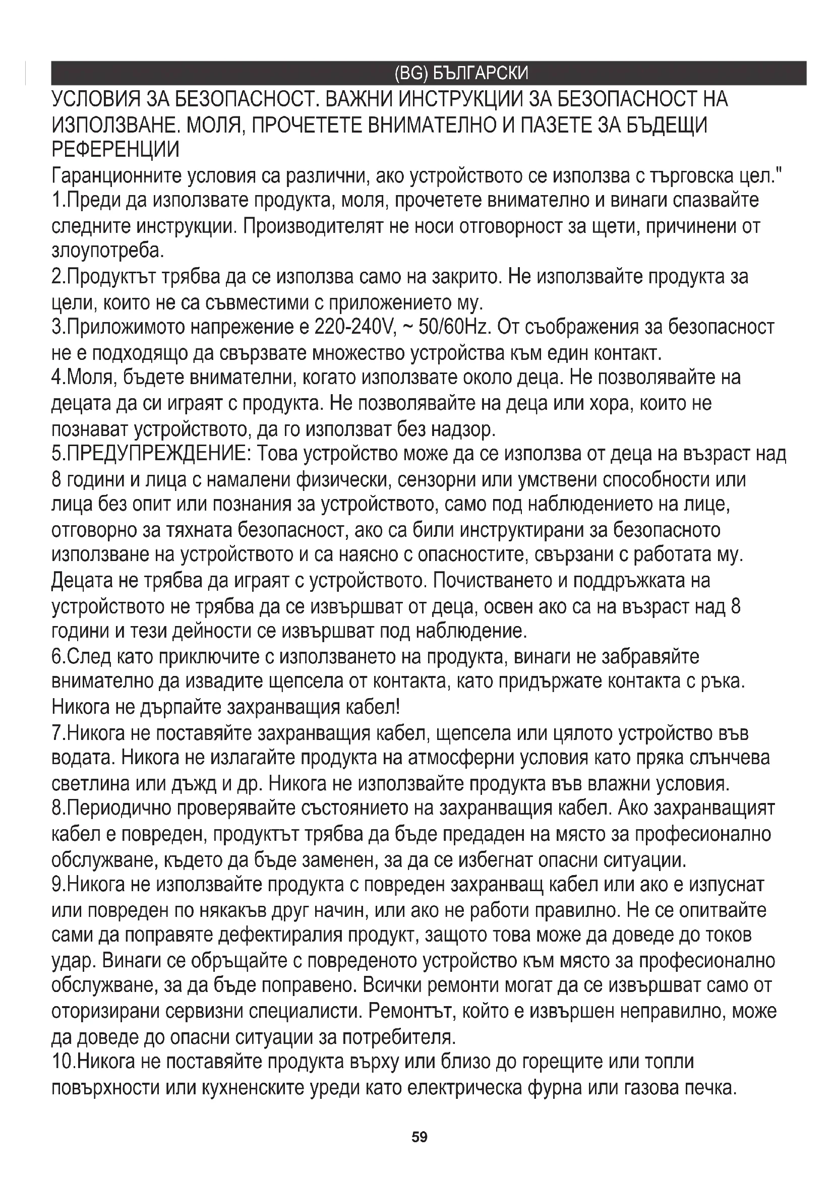 Гаранционните условия са различни, ако устройството се използва с търговска цел." 6.След като приключите с използването на продукта, винаги не забравяйте внимателно да извадите щепсела от контакта, като придържате контакта с ръка. Никога не дърпайте захранващия кабел! 7.Никога не поставяйте захранващия кабел, щепсела или цялото устройство във водата. Никога не излагайте продукта на атмосферни условия като пряка слънчева светлина или дъжд и др. Никога не използвайте продукта във влажни условия. 8.Периодично проверявайте състоянието на захранващия кабел. Ако захранващият кабел е повреден, продуктът трябва да бъде предаден на място за професионално обслужване, където да бъде заменен, за да се избегнат опасни ситуации. 9.Никога не използвайте продукта с повреден захранващ кабел или ако е изпуснат или повреден по някакъв друг начин, или ако не работи правилно. Не се опитвайте сами да поправяте дефектиралия продукт, защото това може да доведе до токов удар. Винаги се обръщайте с повреденото устройство към място за професионално обслужване, за да бъде поправено. Всички ремонти могат да се извършват само от оторизирани сервизни специалисти. Ремонтът, който е извършен неправилно, може да доведе до опасни ситуации за потребителя. 10.Никога не поставяйте продукта върху или близо до горещите или топли повърхности или кухненските уреди като електрическа фурна или газова печка. 1.Преди да използвате продукта, моля, прочетете внимателно и винаги спазвайте следните инструкции. Производителят не носи отговорност за щети, причинени от злоупотреба. 2.Продуктът трябва да се използва само на закрито. Не използвайте продукта за цели, които не са съвместими с приложението му. 4.Моля, бъдете внимателни, когато използвате около деца. Не позволявайте на децата да си играят с продукта. Не позволявайте на деца или хора, които не познават устройството, да го използват без надзор. 5.ПРЕДУПРЕЖДЕНИЕ: Това устройство може да се използва от деца на възраст над 8 години и лица с намалени физически, сензорни или умствени способности или лица без опит или познания за устройството, само под наблюдението на лице, отговорно за тяхната безопасност, ако са били инструктирани за безопасното използване на устройството и са наясно с опасностите, свързани с работата му. Децата не трябва да играят с устройството. Почистването и поддръжката на устройството не трябва да се извършват от деца, освен ако са на възраст над 8 години и тези дейности се извършват под наблюдение. 3.Приложимото напрежение е 220-240V, ~ 50/60Hz. От съображения за безопасност не е подходящо да свързвате множество устройства към един контакт. (BG) БЪЛГАРСКИ60 11.Никога не използвайте продукта близо до горими вещества. 12.Не оставяйте кабела да виси над ръба на плота или да докосва горещи повърхности. 13.Никога не оставяйте продукта свързан към източника на захранване без надзор. Дори когато употребата е прекъсната за кратко, изключете го от мрежата и изключете захранването. 14.За да се осигури допълнителна защита, се препоръчва да се монтира устройство за остатъчен ток (RCD) в силовата верига с номинален остатъчен ток не повече от 30 mA. По този въпрос се свържете с професионален електротехник. 15.Ако каната е препълнена, може да прелее с вряща вода. 28.Не мийте поставката на чайника директно във водата, а само избършете със суха