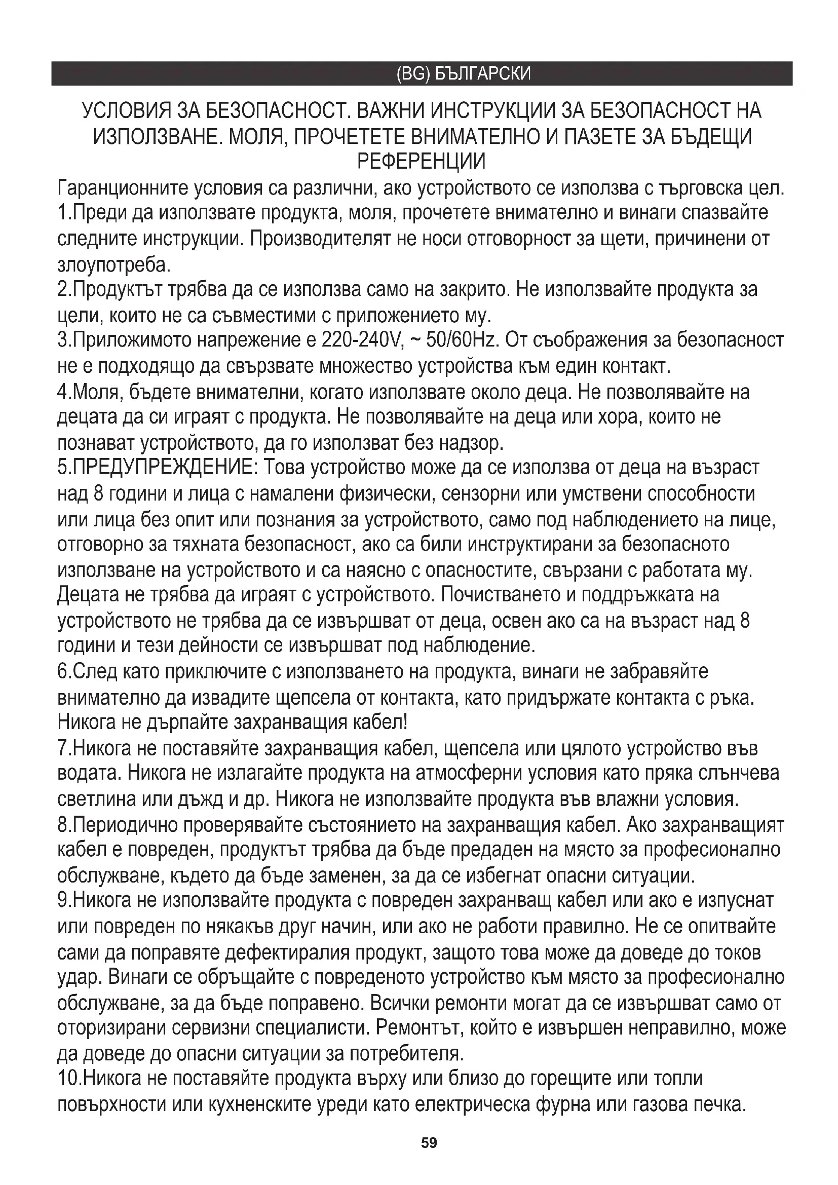 ﺪﯾﺪﮭﺗ تﺎﻧﻮﻜﻤﻟا ﻞﻜﺸﺗ ﺪﻗ زﺎﮭﺠﻟا ﻲﻓ تﺎﯾرﺎﻄﺑ كﺎﻨھ نﺎﻛ اذإ .ﺎﮭﻣاﺪﺨﺘﺳاو ﺎﮭﻣاﺪﺨﺘﺳا ةدﺎﻋإ ،.ﻞﺼﻔﻨﻣ ﻞﻜﺸﺑ ﺔﻧﺰﺨﻤﻟا ﺔﻄﻘﻨﻟا ﻰﻟإ ﺎﮭﺋﺎﻄﻋإو ﺎﮭﺟاﺮﺧإ ﻚﯿﻠﻌﻓ59 (BG) БЪЛГАРСКИ 3.Приложимото напрежение е 220-240V, ~ 50/60Hz. От съображения за безопасност не е подходящо да свързвате множество устройства към един контакт. 2.Продуктът трябва да се използва само на закрито. Не използвайте продукта за цели, които не са съвместими с приложението му. 1.Преди да използвате продукта, моля, прочетете внимателно и винаги спазвайте следните инструкции. Производителят не носи отговорност за щети, причинени от злоупотреба. 7.Никога не поставяйте захранващия кабел, щепсела или цялото устройство във водата. Никога не излагайте продукта на атмосферни условия като пряка слънчева светлина или дъжд и др. Никога не използвайте продукта във влажни условия. УСЛОВИЯ ЗА БЕЗОПАСНОСТ. ВАЖНИ ИНСТРУКЦИИ ЗА БЕЗОПАСНОСТ НА ИЗПОЛЗВАНЕ. МОЛЯ, ПРОЧЕТЕТЕ ВНИМАТЕЛНО И ПАЗЕТЕ ЗА БЪДЕЩИ