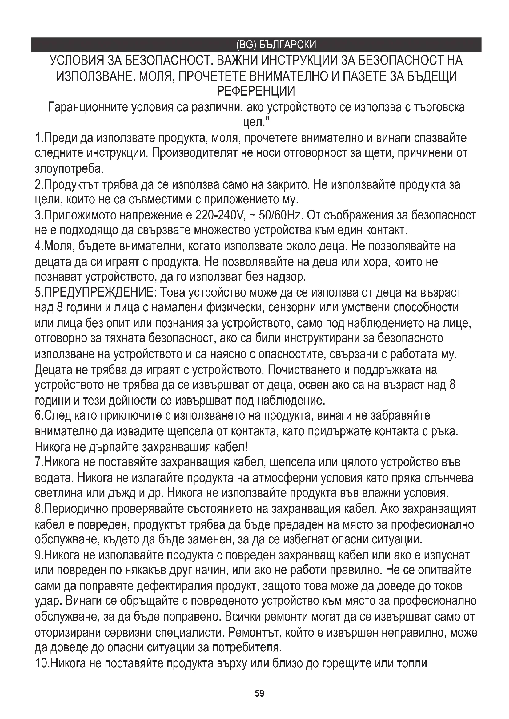 9.Никога не използвайте продукта с повреден захранващ кабел или ако е изпуснат или повреден по някакъв друг начин, или ако не работи правилно. Не се опитвайте сами да поправяте дефектиралия продукт, защото това може да доведе до токов удар. Винаги се обръщайте с повреденото устройство към място за професионално обслужване, за да бъде поправено. Всички ремонти могат да се извършват само от оторизирани сервизни специалисти. Ремонтът, който е извършен неправилно, може да доведе до опасни ситуации за потребителя. 6.След като приключите с използването на продукта, винаги не забравяйте внимателно да извадите щепсела от контакта, като придържате контакта с ръка. Никога не дърпайте захранващия кабел! 7.Никога не поставяйте захранващия кабел, щепсела или цялото устройство във водата. Никога не излагайте продукта на атмосферни условия като пряка слънчева светлина или дъжд и др. Никога не използвайте продукта във влажни условия. 8.Периодично проверявайте състоянието на захранващия кабел. Ако захранващият кабел е повреден, продуктът трябва да бъде предаден на място за професионално обслужване, където да бъде заменен, за да се избегнат опасни ситуации. 10.Никога не поставяйте продукта върху или близо до горещите или топли 2.Продуктът трябва да се използва само на закрито. Не използвайте продукта за цели, които не са съвместими с приложението му. 3.Приложимото напрежение е 220-240V, ~ 50/60Hz. От съображения за безопасност не е подходящо да свързвате множество устройства към един контакт. 4.Моля, бъдете внимателни, когато използвате около деца. Не позволявайте на децата да си играят с продукта. Не позволявайте на деца или хора, които не познават устройството, да го използват без надзор. 1.Преди да използвате продукта, моля, прочетете внимателно и винаги спазвайте следните инструкции. Производителят не носи отговорност за щети, причинени от злоупотреба. 5.ПРЕДУПРЕЖДЕНИЕ: Това устройство може да се използва от деца на възраст над 8 години и лица с намалени физически, сензорни или умствени способности или лица без опит или познания за устройството, само под наблюдението на лице, отговорно за тяхната безопасност, ако са били инструктирани за безопасното използване на устройството и са наясно с опасностите, свързани с работата му. Децата не трябва да играят с устройството. Почистването и поддръжката на устройството не трябва да се извършват от деца, освен ако са на възраст над 8 години и тези дейности се извършват под наблюдение.60 13.Никога не оставяйте продукта свързан към източника на захранване без надзор. Дори когато употребата е прекъсната за кратко, изключете го от мрежата и изключете захранването. повърхности или кухненските уреди като електрическа фурна или газова печка. 11.Никога не използвайте продукта близо до горими вещества. 12.Не оставяйте кабела да виси над ръба на плота или да докосва горещи повърхности. 24.Никога не използвайте каната без филтър или с отворен капак (автоматичното изключване няма да работи). 29.Деца на възраст от 3 до 8 години могат да активират и деактивират устройството само когато то е в нормалното си положение на употреба, те са наблюдавани или инструктирани за безопасна употреба и разбират произтичащите рискове. Деца на възраст от 3 до 8 години не могат да свързват устройство, да работят, да почистват 25.Почиствайте периодично к