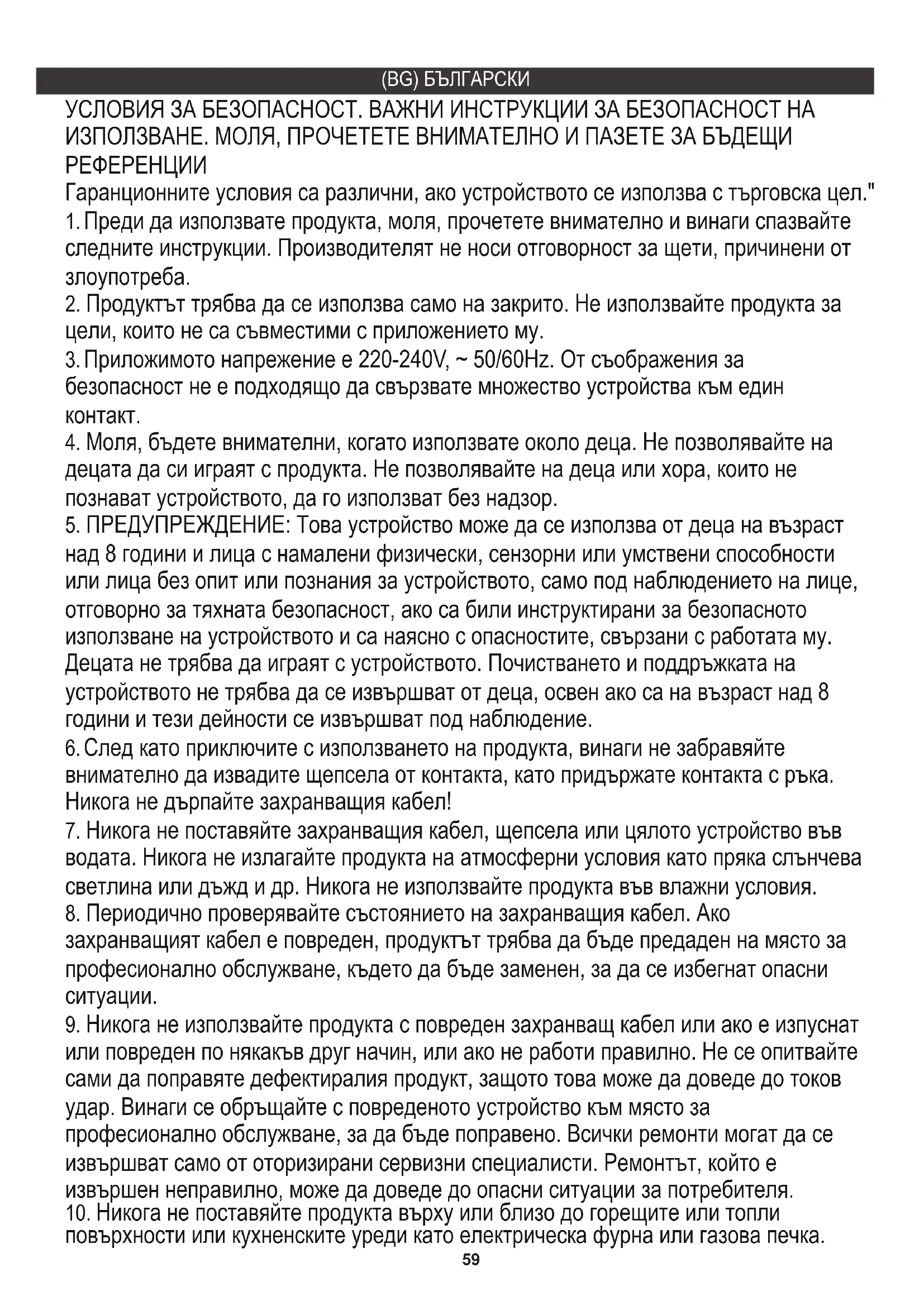 над 8 години и лица с намалени физически, сензорни или умствени способности или лица без опит или познания за устройството, само под наблюдението на лице, отговорно за тяхната безопасност, ако са били инструктирани за безопасното използване на устройството и са наясно с опасностите, свързани с работата му. Децата не трябва да играят с устройството. Почистването и поддръжката на устройството не трябва да се извършват от деца, освен ако са на възраст над 8 години и тези дейности се извършват под наблюдение. (BG) БЪЛГАРСКИ60