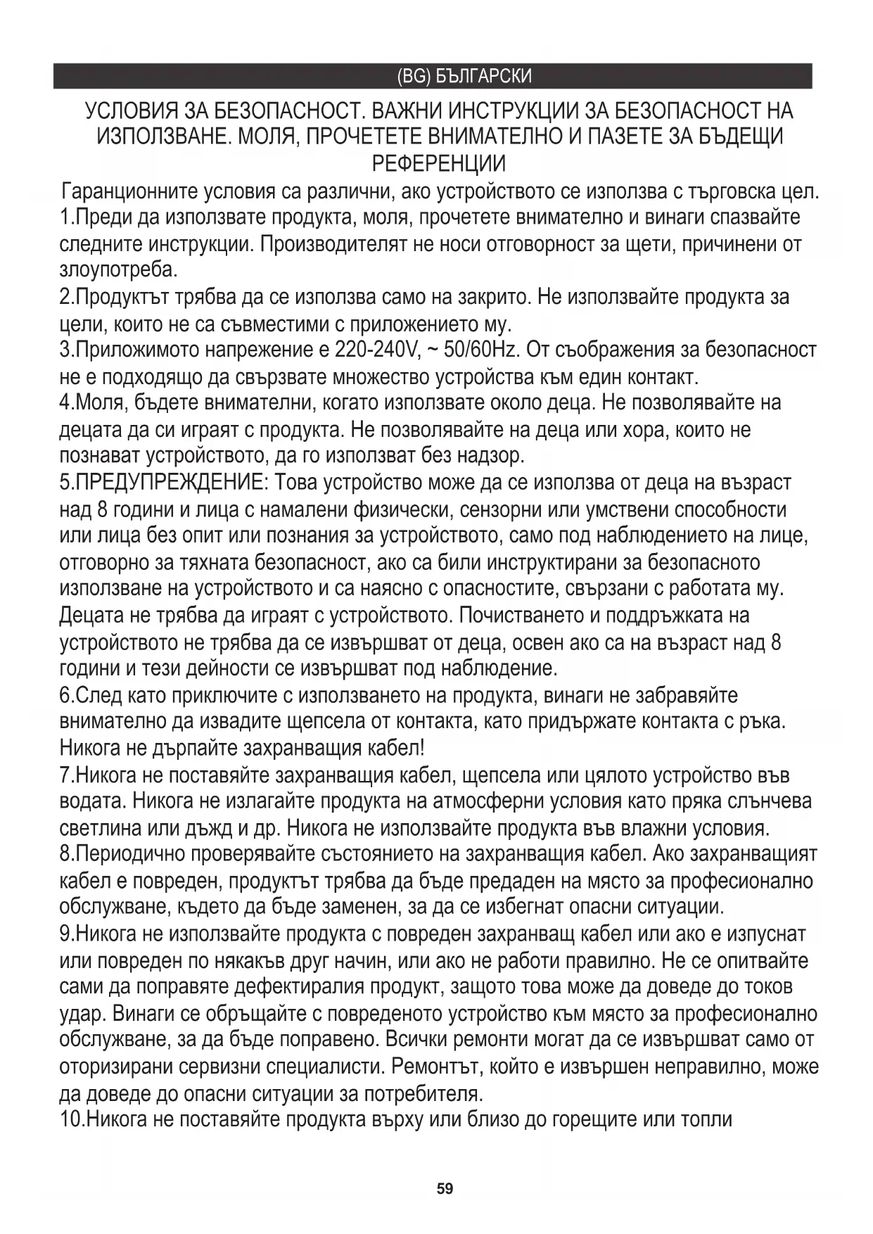 ﺪﯾﺪﮭﺗ تﺎﻧﻮﻜﻤﻟا ﻞﻜﺸﺗ ﺪﻗ زﺎﮭﺠﻟا ﻲﻓ تﺎﯾرﺎﻄﺑ كﺎﻨھ نﺎﻛ اذإ .ﺎﮭﻣاﺪﺨﺘﺳاو ﺎﮭﻣاﺪﺨﺘﺳا ةدﺎﻋإ ،.ﻞﺼﻔﻨﻣ ﻞﻜﺸﺑ ﺔﻧﺰﺨﻤﻟا ﺔﻄﻘﻨﻟا ﻰﻟإ ﺎﮭﺋﺎﻄﻋإو ﺎﮭﺟاﺮﺧإ ﻚﯿﻠﻌﻓ59 7.Никога не поставяйте захранващия кабел, щепсела или цялото устройство във водата. Никога не излагайте продукта на атмосферни условия като пряка слънчева светлина или дъжд и др. Никога не използвайте продукта във влажни условия. 8.Периодично проверявайте състоянието на захранващия кабел. Ако захранващият кабел е повреден, продуктът трябва да бъде предаден на място за професионално обслужване, където да бъде заменен, за да се избегнат опасни ситуации. 9.Никога не използвайте продукта с повреден захранващ кабел или ако е изпуснат или повреден по някакъв друг начин, или ако не работи правилно. Не се опитвайте сами да поправяте дефектиралия продукт, защото това може да доведе до токов удар. Винаги се обръщайте с повреденото устройство към място за професионално обслужване, за да бъде поправено. Всички ремонти могат да се извършват само от оторизирани сервизни специалисти. Ремонтът, който е извършен неправилно, може да доведе до опасни ситуации за потребителя. 1.Преди да използвате продукта, моля, прочетете внимателно и винаги спазвайте следните инструкции. Производителят не носи отговорност за щети, причинени от злоупотреба. УСЛОВИЯ ЗА БЕЗОПАСНОСТ. ВАЖНИ ИНСТРУКЦИИ ЗА БЕЗОПАСНОСТ НА ИЗПОЛЗВАНЕ. МОЛЯ, ПРОЧЕТЕТЕ ВНИМАТЕЛНО И ПАЗЕТЕ ЗА БЪДЕЩИ