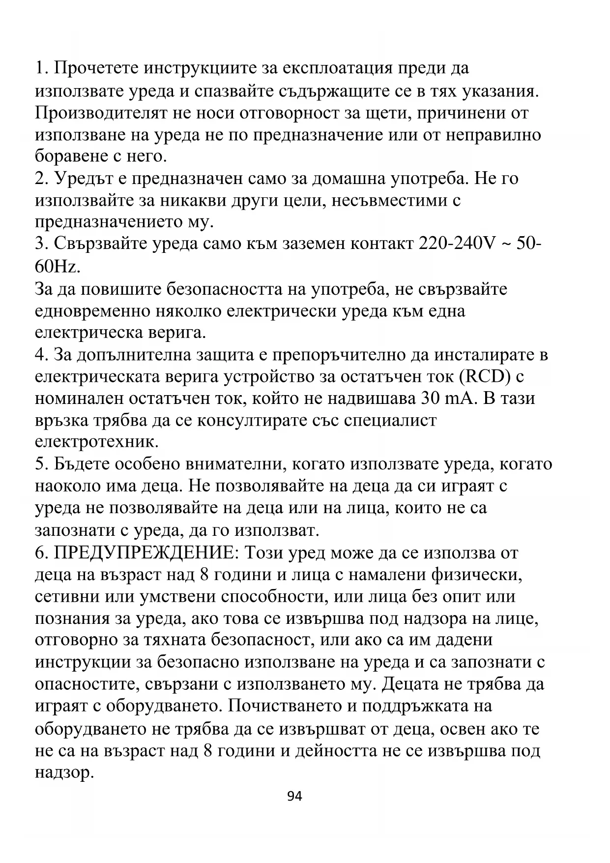 деца на възраст над 8 години и лица с намалени физически, сетивни или умствени способности, или лица без опит или познания за уреда, ако това се извършва под надзора на лице, отговорно за тяхната безопасност, или ако са им дадени инструкции за безопасно използване на уреда и са запознати с опасностите, свързани с използването му. Децата не трябва да играят с оборудването. Почистването и поддръжката на оборудването не трябва да се извършват от деца, освен ако те не са на възраст над 8 години и дейността не се извършва под надзор.95