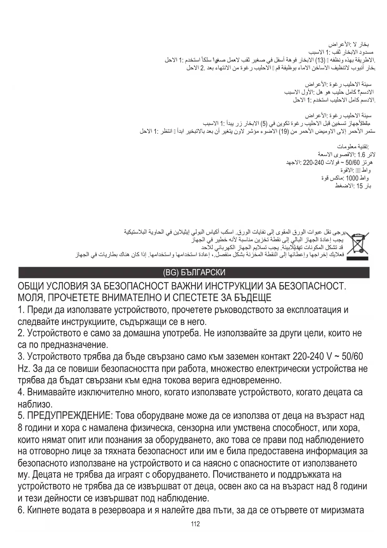 ТЕХНИЧЕСКИ ДАННИ: Капацитет макс: 1,6 литра Напрежение: 220-240V ~ 50 / 60Hz Мощност: 850W Максимална мощност: 1000W Налягане: 15 бара За да защитите околната си среда: моля, отделете картонените кутии и найлоновите торбички и ги изхвърлете в съответните кошчета за отпадъци. Използваният уред трябва да бъде доставен до специалните пунктове за събиране, които могат да повлияят на околната среда. Не изхвърляйте този уред в обикновен кош за отпадъци.