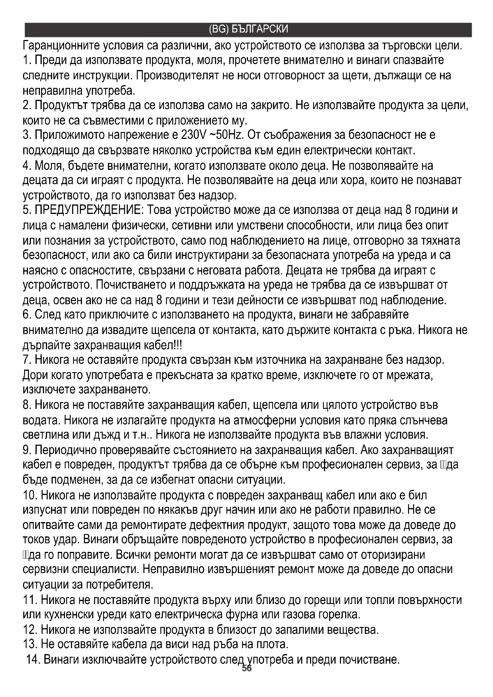 изпуснат или повреден по някакъв друг начин или ако не работи правилно. Не се опитвайте сами да ремонтирате дефектния продукт, защото това може да доведе до токов удар. Винаги обръщайте повреденото устройство в професионален сервиз, за да го поправите. Всички ремонти могат да се извършват само от оторизирани сервизни специалисти. Неправилно извършеният ремонт може да доведе до опасни ситуации за потребителя.