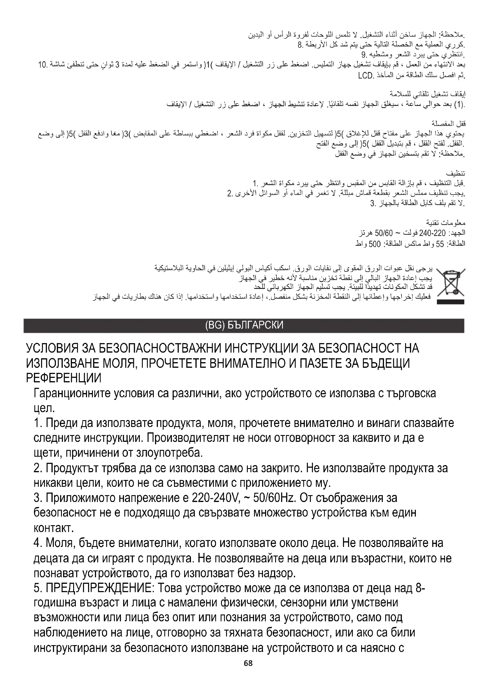 Мощност: 55W Това устройство има превключвател за заключване (5) за улесняване на съхранението. За да заключите пресата за коса, просто стиснете дръжките (3) заедно и натиснете превключвателя за заключване (5) в заключено положение. За да отключите, превключете го (5) в позиция за отключване. Макс. мощност: 500W 10. След приключване на работата изключете уреда за изправяне. Натиснете бутона за включване/изключване (1) и го задръжте за около 3 секунди, докато LCD дисплеят се изключи.