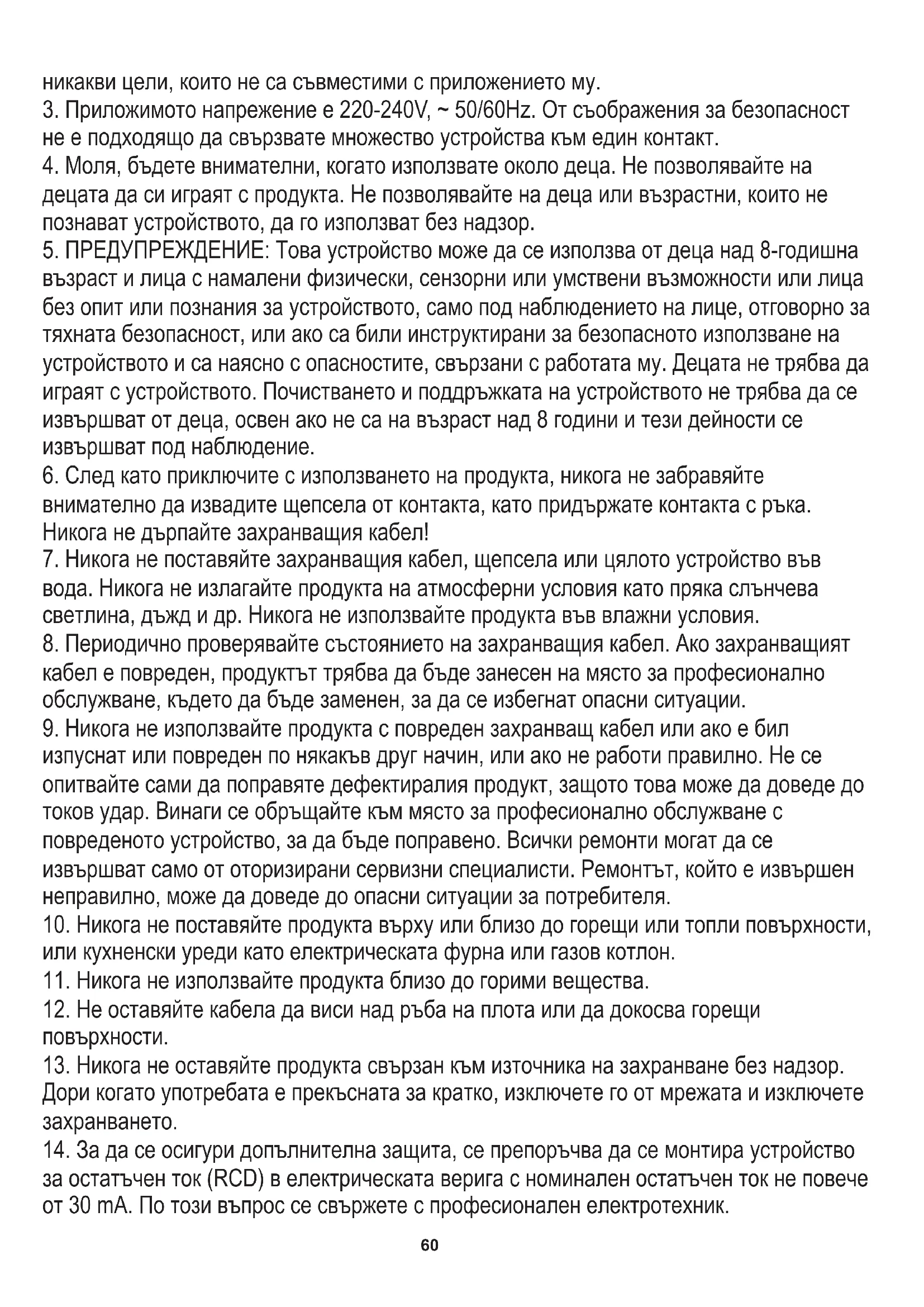 възраст и лица с намалени физически, сензорни или умствени възможности или лица без опит или познания за устройството, само под наблюдението на лице, отговорно за тяхната безопасност, или ако са били инструктирани за безопасното използване на устройството и са наясно с опасностите, свързани с работата му. Децата не трябва да играят с устройството. Почистването и поддръжката на устройството не трябва да се извършват от деца, освен ако не са на възраст над 8 години и тези дейности се извършват под наблюдение.
