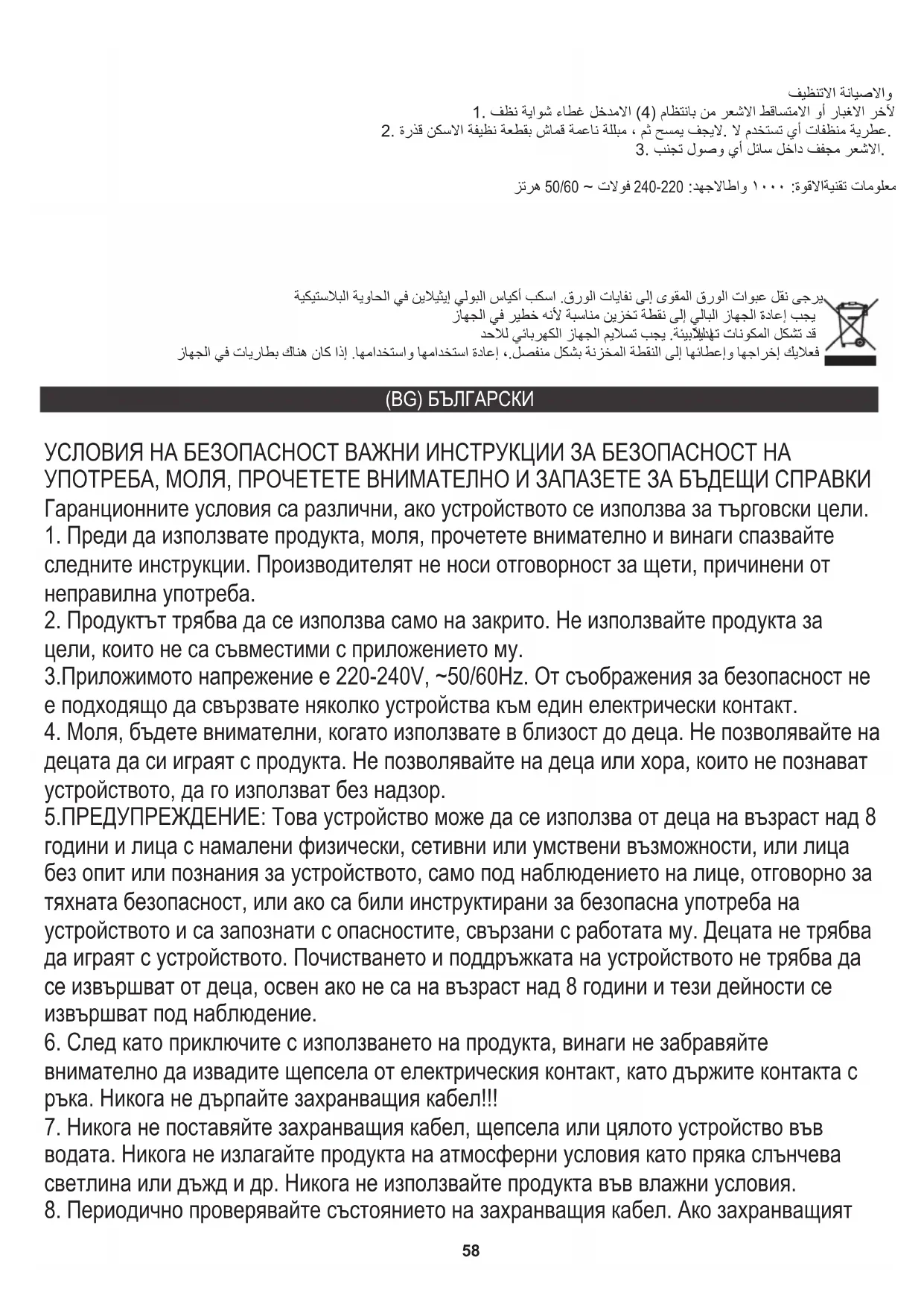 децата да си играят с продукта. Не позволявайте на деца или хора, които не познават устройството, да го използват без надзор. 5.ПРЕДУПРЕЖДЕНИЕ: Това устройство може да се използва от деца на възраст над 8 години и лица с намалени физически, сетивни или умствени възможности, или лица без опит или познания за устройството, само под наблюдението на лице, отговорно за тяхната безопасност, или ако са били инструктирани за безопасна употреба на устройството и са запознати с опасностите, свързани с работата му. Децата не трябва да играят с устройството. Почистването и поддръжката на устройството не трябва да се извършват от деца, освен ако не са на възраст над 8 години и тези дейности се извършват под наблюдение. УСЛОВИЯ НА БЕЗОПАСНОСТ ВАЖНИ ИНСТРУКЦИИ ЗА БЕЗОПАСНОСТ НА УПОТРЕБА, МОЛЯ, ПРОЧЕТЕТЕ ВНИМАТЕЛНО И ЗАПАЗЕТЕ ЗА БЪДЕЩИ СПРАВКИ 3.Приложимото напрежение е 220-240V, ~50/60Hz. От съображения за безопасност не е подходящо да свързвате няколко устройства към един електрически контакт.
