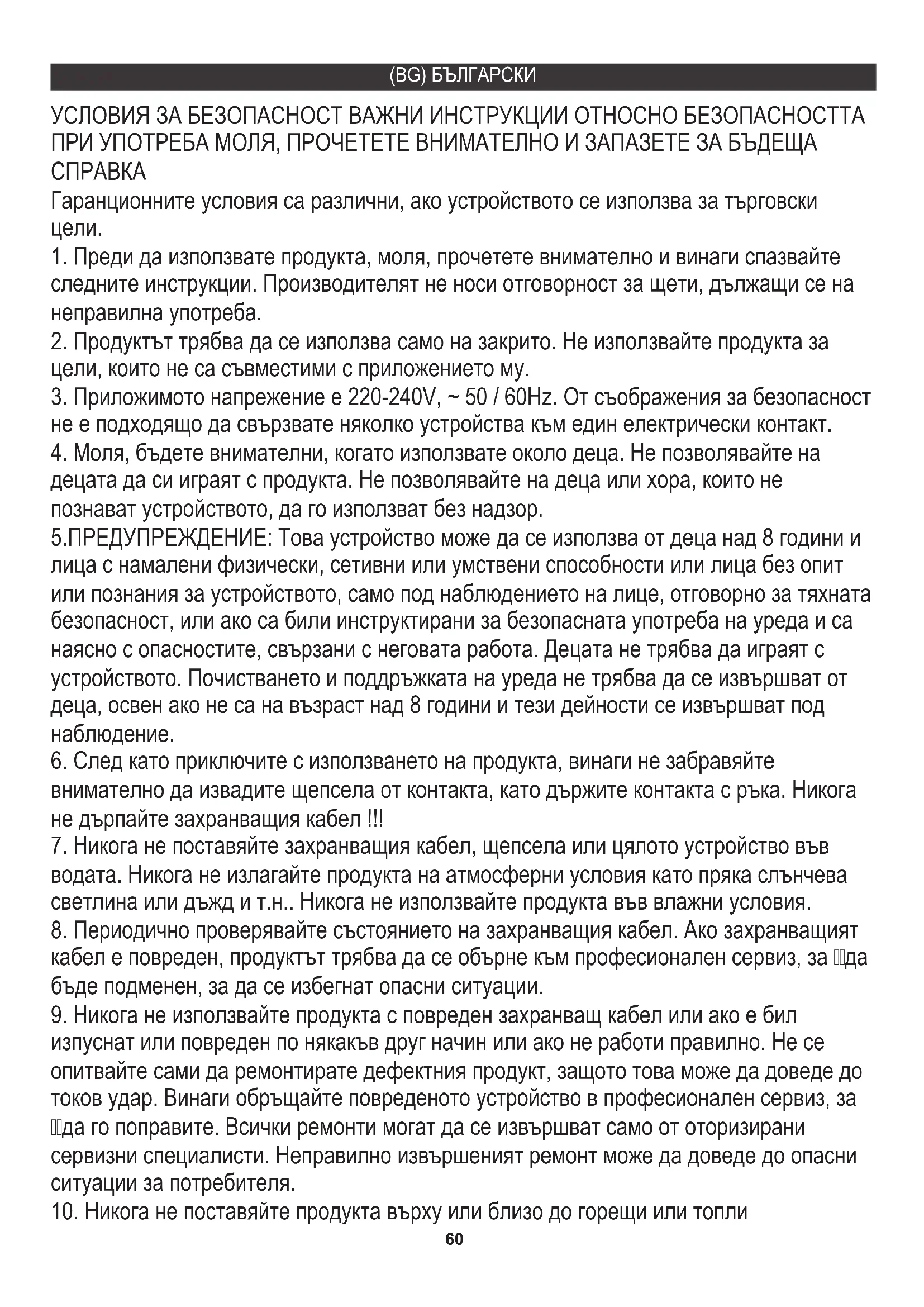 следните инструкции. Производителят не носи отговорност за щети, дължащи се на неправилна употреба. 5.ПРЕДУПРЕЖДЕНИЕ: Това устройство може да се използва от деца над 8 години и лица с намалени физически, сетивни или умствени способности или лица без опит или познания за устройството, само под наблюдението на лице, отговорно за тяхната безопасност, или ако са били инструктирани за безопасната употреба на уреда и са наясно с опасностите, свързани с неговата работа. Децата не трябва да играят с устройството. Почистването и поддръжката на уреда не трябва да се извършват от деца, освен ако не са на възраст над 8 години и тези дейности се извършват под наблюдение.