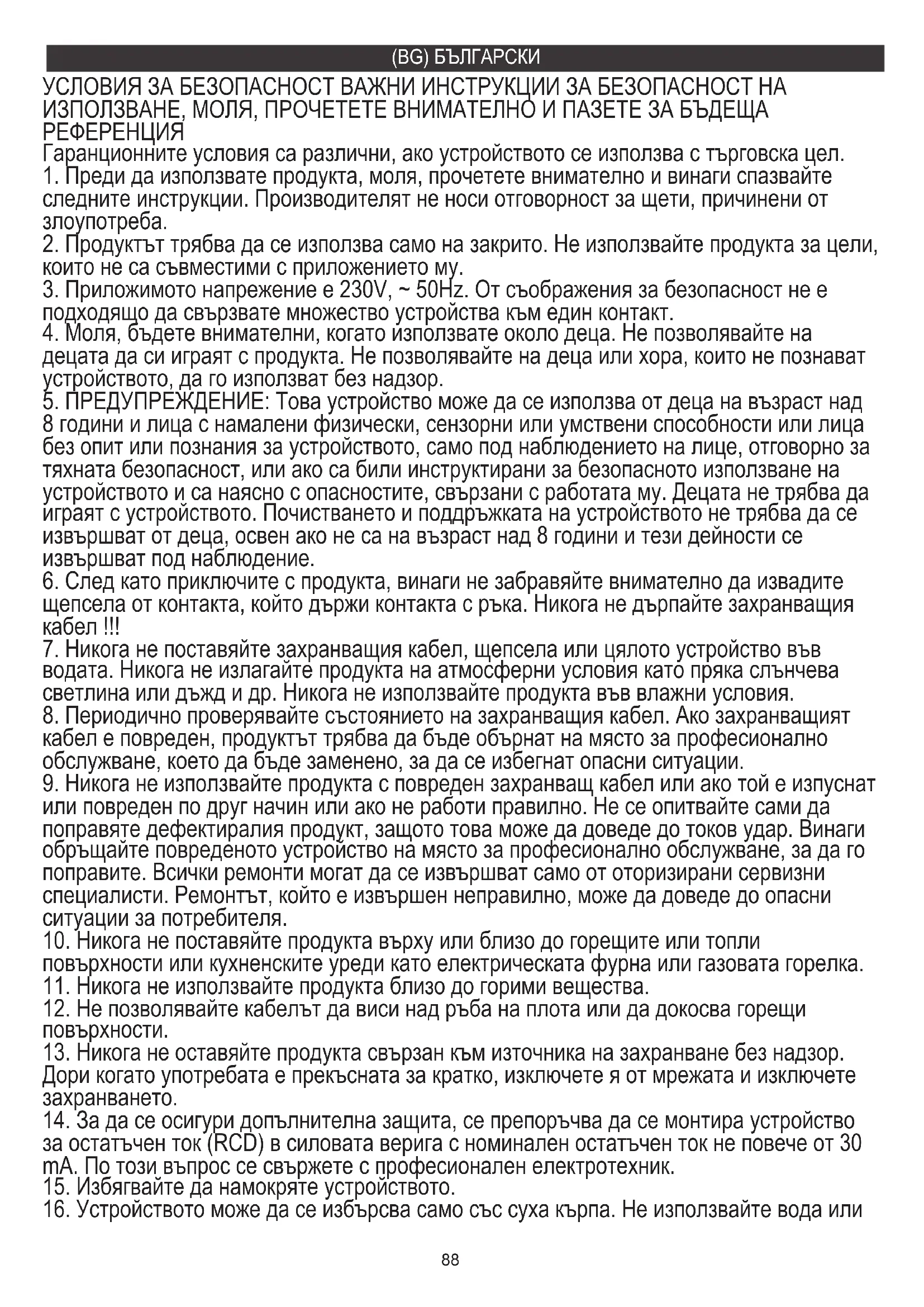 8 години и лица с намалени физически, сензорни или умствени способности или лица без опит или познания за устройството, само под наблюдението на лице, отговорно за тяхната безопасност, или ако са били инструктирани за безопасното използване на устройството и са наясно с опасностите, свързани с работата му. Децата не трябва да играят с устройството. Почистването и поддръжката на устройството не трябва да се извършват от деца, освен ако не са на възраст над 8 години и тези дейности се извършват под наблюдение.