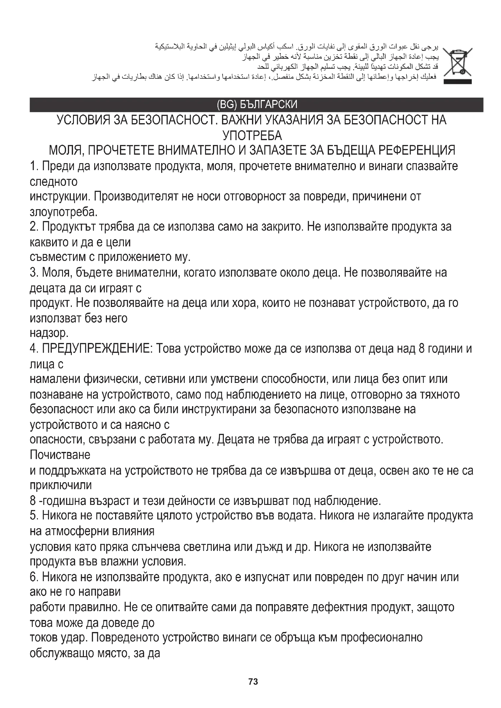 ﺪﯾﺪﮭﺗ تﺎﻧﻮﻜﻤﻟا ﻞﻜﺸﺗ ﺪﻗ زﺎﮭﺠﻟا ﻲﻓ تﺎﯾرﺎﻄﺑ كﺎﻨھ نﺎﻛ اذإ .ﺎﮭﻣاﺪﺨﺘﺳاو ﺎﮭﻣاﺪﺨﺘﺳا ةدﺎﻋإ ،.ﻞﺼﻔﻨﻣ ﻞﻜﺸﺑ ﺔﻧﺰﺨﻤﻟا ﺔﻄﻘﻨﻟا ﻰﻟإ ﺎﮭﺋﺎﻄﻋإو ﺎﮭﺟاﺮﺧإ ﻚﯿﻠﻌﻓ (BG) БЪЛГАРСКИ намалени физически, сетивни или умствени способности, или лица без опит или безопасност или ако са били инструктирани за безопасното използване на устройството и са наясно с и поддръжката на устройството не трябва да се извършва от деца, освен ако те не са