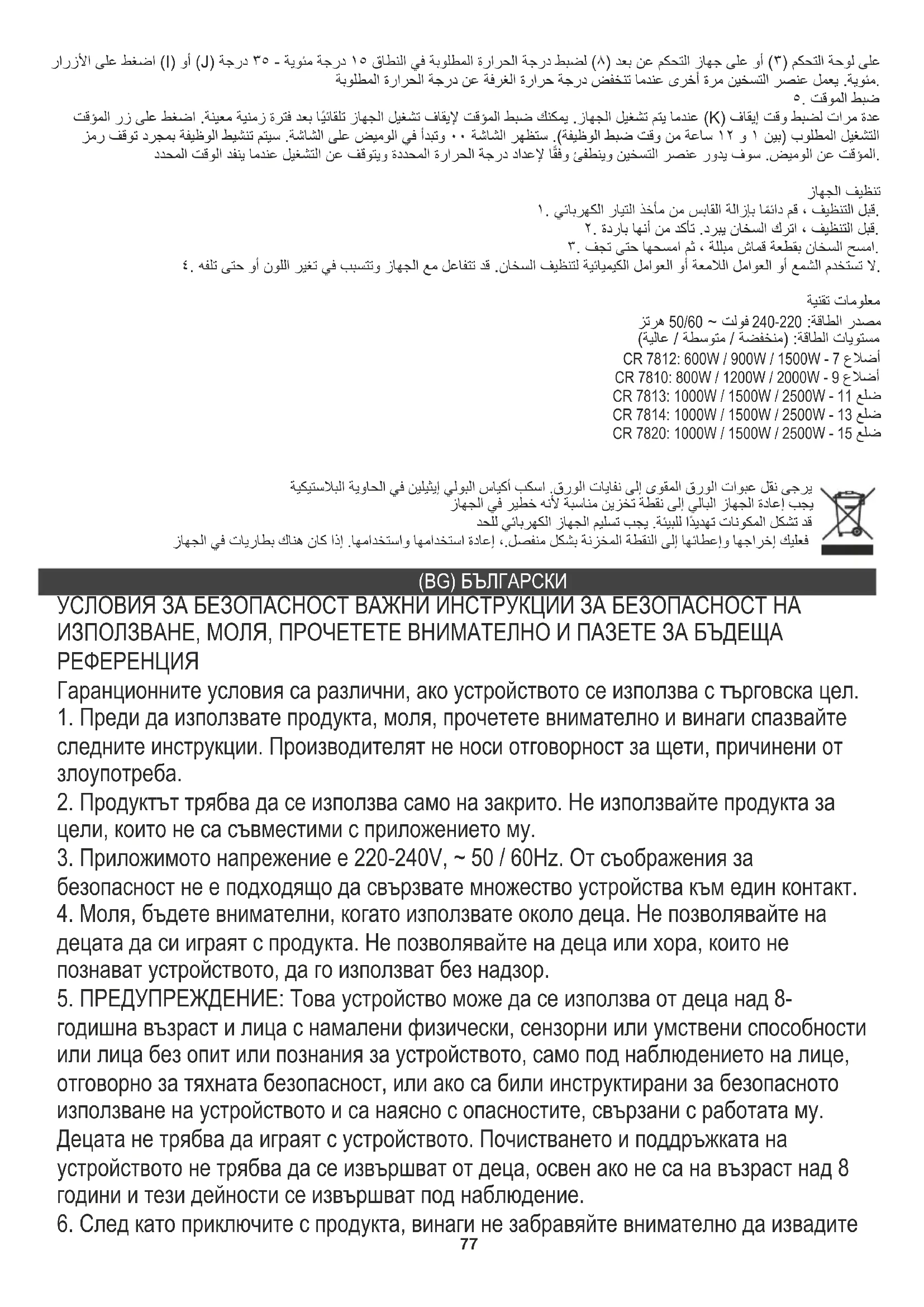 да реагират с устройството и да причинят обезцветяване или дори повреда. ТЕХНИЧЕСКИ ДАННИ Източник на захранване: 220-240V ~ 50/60 Hz Нива на мощност: (ниска / средна / висока) CR 7812: 600W / 900W / 1500W - 7 ребра CR 7810: 800W / 1200W / 2000W - 9 ребра CR 7813: 1000W / 1500W / 2500W - 11 ребра CR 7814: 1000W / 1500W / 2500W - 13 ребра CR 7820: 1000W / 1500W / 2500W - 15 ребра Моля, прехвърлете картонените опаковки в отпадъчна хартия. Изсипете полиетиленовите торбички (PE) в пластмасовия контейнер. Износеното устройство трябва да се върне в съответното място за съхранение, тъй като е опасно в устройството съставките могат да представляват заплаха за околната среда. Електрическото устройство трябва да бъде предадено докрай повторното му използване и използване. Ако в устройството има батерии, трябва да извадите и да дадете на точката, съхранявана отделно.