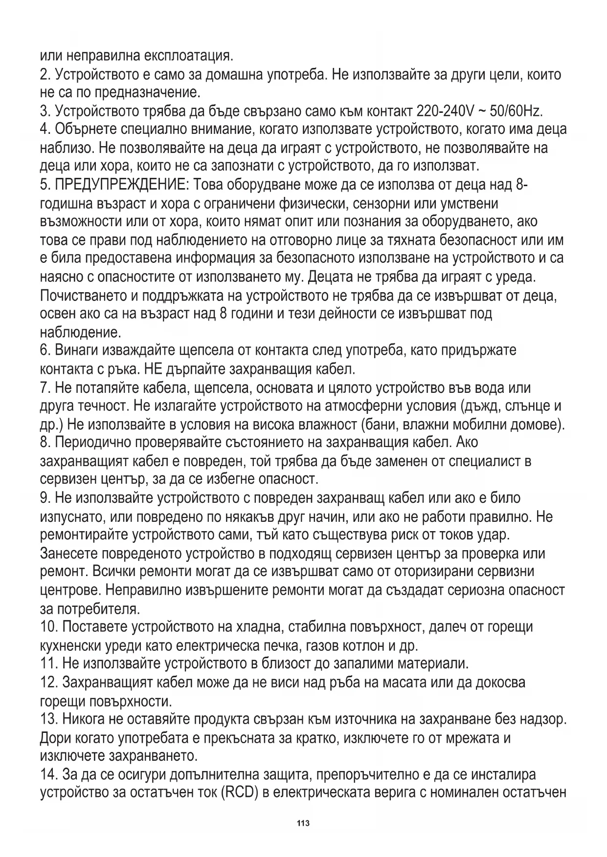годишна възраст и хора с ограничени физически, сензорни или умствени възможности или от хора, които нямат опит или познания за оборудването, ако това се прави под наблюдението на отговорно лице за тяхната безопасност или им е била предоставена информация за безопасното използване на устройството и са наясно с опасностите от използването му. Децата не трябва да играят с уреда. Почистването и поддръжката на устройството не трябва да се извършват от деца, освен ако са на възраст над 8 години и тези дейности се извършват под наблюдение.