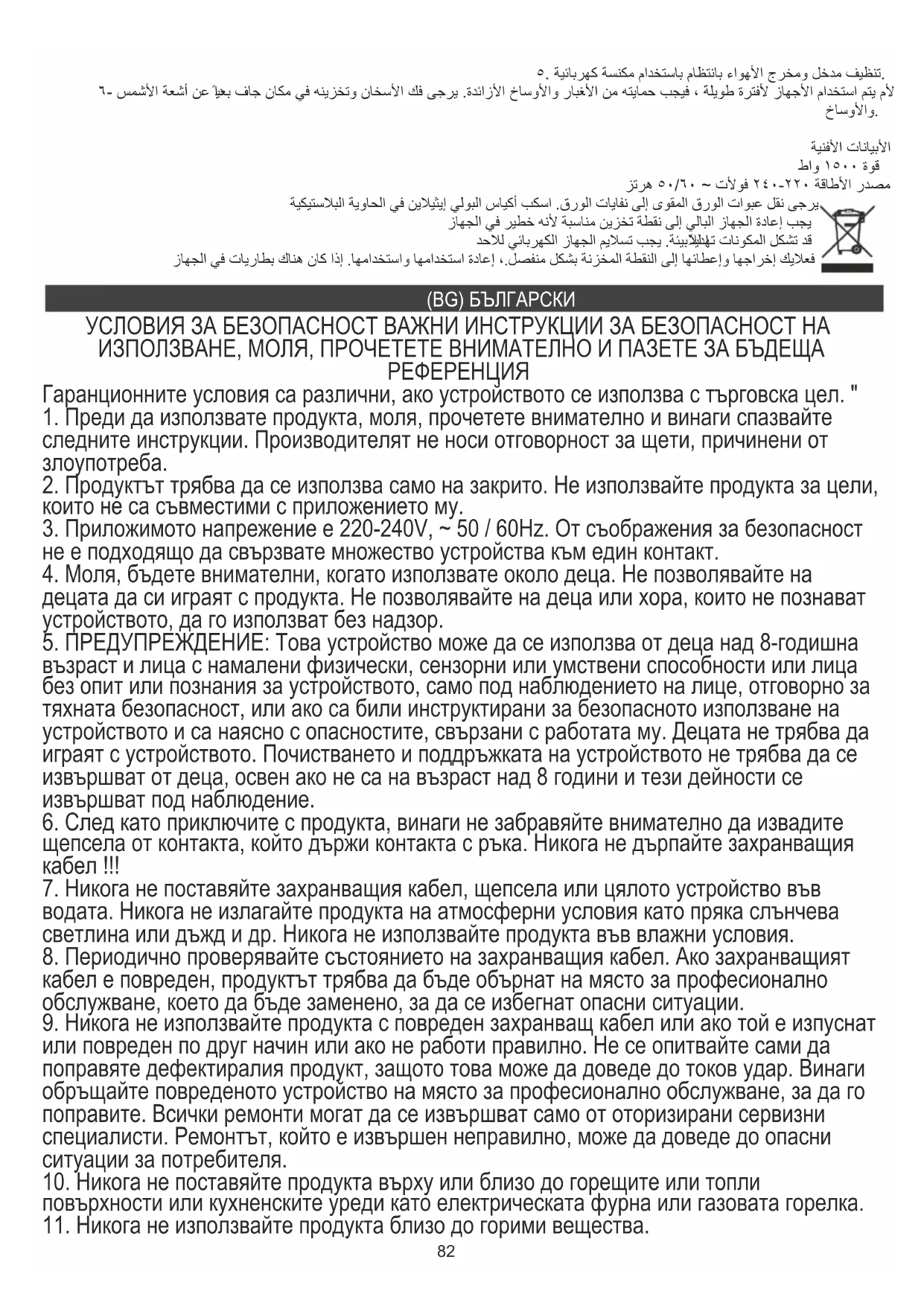 демонтирайте нагревателя и го съхранявайте на сухо място, далеч от слънчева светлина и мръсотия. ТЕХНИЧЕСКИ ДАННИ Мощност 1500W Захранване 220-240V ~ 50 / 60Hz Моля, прехвърлете картонените опаковки в отпадъчна хартия. Изсипете полиетиленовите торбички (PE) в пластмасовия контейнер. Износеното устройство трябва да се върне в съответното място за съхранение, тъй като е опасно в устройството съставките могат да представляват заплаха за околната среда. Електрическото устройство трябва да бъде предадено докрай повторното му използване и използване. Ако в устройството има батерии, трябва да извадите и да дадете на точката, съхранявана отделно.85