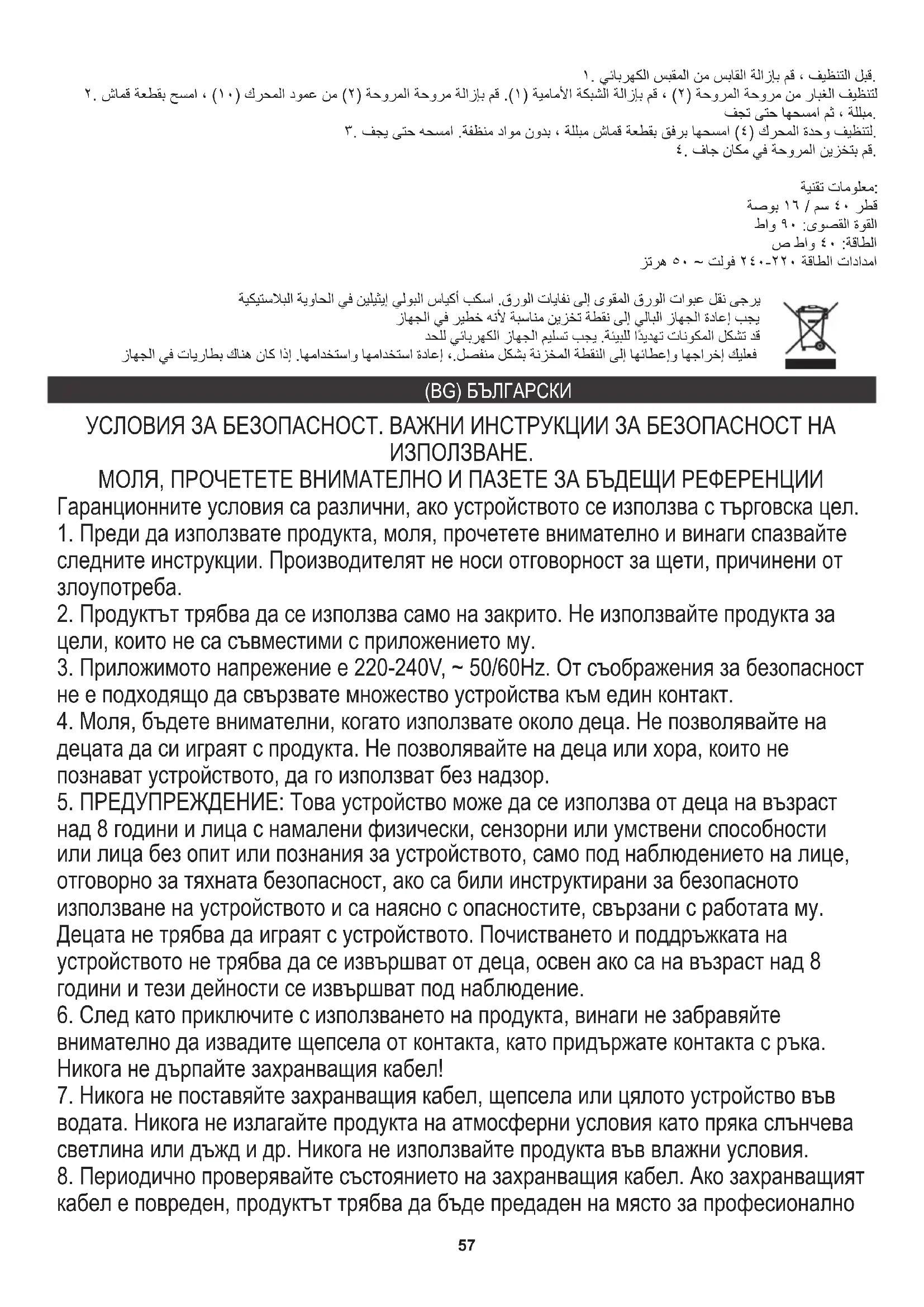 ТЕХНИЧЕСКА ИНФОРМАЦИЯ Диаметър: 40 см / 16 " Максимална мощност: 90W Мощност: 40W Източник на захранване: 220-240V ~ 50Hz Ниво на шум: 53,6 Db Моля, прехвърлете картонените опаковки в отпадъчна хартия. Изсипете полиетиленовите торбички (PE) в пластмасовия контейнер. Износеното устройство трябва да се върне в съответното място за съхранение, тъй като е опасно в устройството съставките могат да представляват заплаха за околната среда. Електрическото устройство трябва да бъде предадено докрай повторното му използване и използване. Ако в устройството има батерии, трябва да извадите и да дадете на точката, съхранявана отделно.
