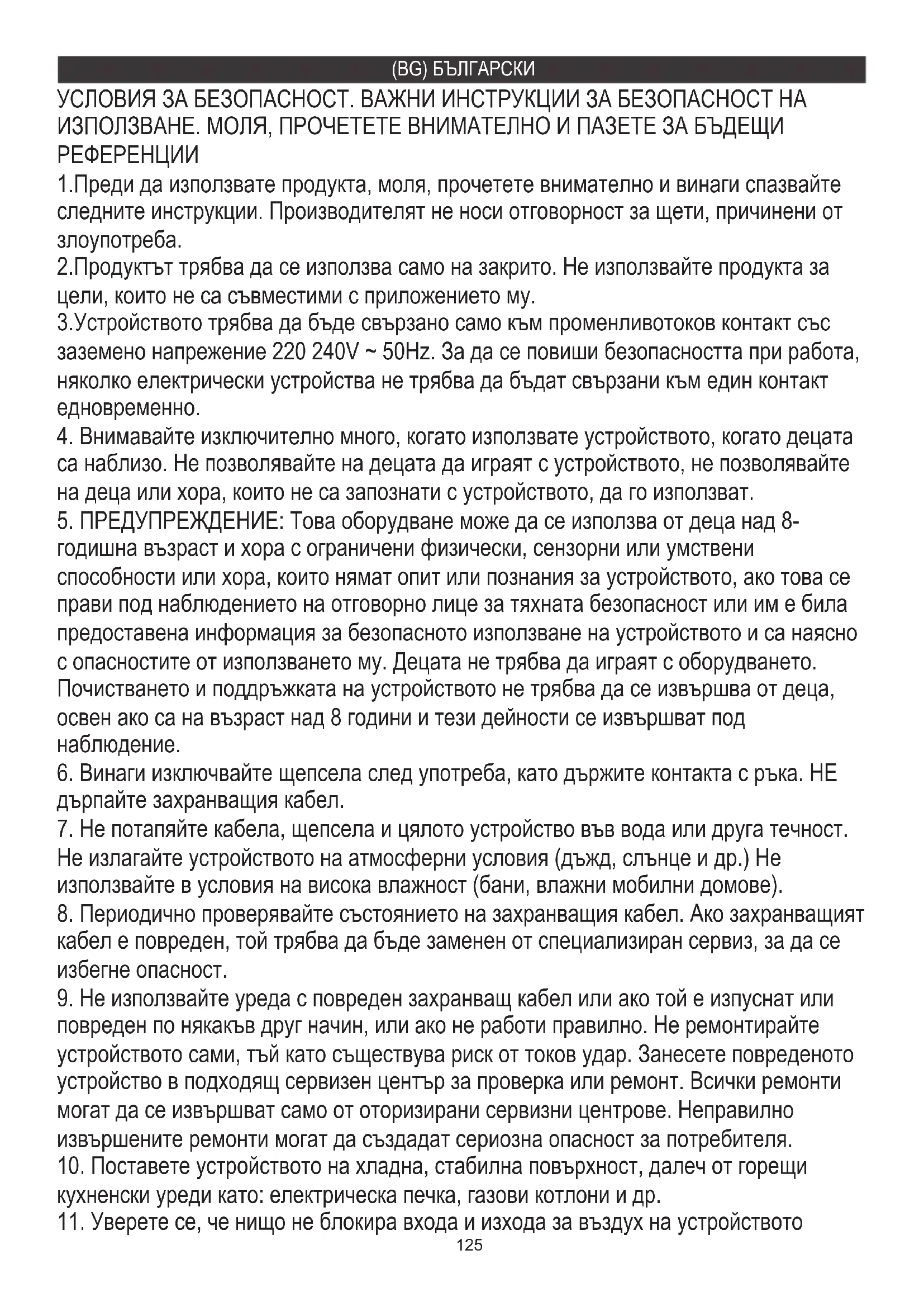ﺪﯾﺪﮭﺗ تﺎﻧﻮﻜﻤﻟا ﻞﻜﺸﺗ ﺪﻗ زﺎﮭﺠﻟا ﻲﻓ تﺎﯾرﺎﻄﺑ كﺎﻨھ نﺎﻛ اذإ .ﺎﮭﻣاﺪﺨﺘﺳاو ﺎﮭﻣاﺪﺨﺘﺳا ةدﺎﻋإ ،.ﻞﺼﻔﻨﻣ ﻞﻜﺸﺑ ﺔﻧﺰﺨﻤﻟا ﺔﻄﻘﻨﻟا ﻰﻟإ ﺎﮭﺋﺎﻄﻋإو ﺎﮭﺟاﺮﺧإ ﻚﯿﻠﻌﻓ125 1.Преди да използвате продукта, моля, прочетете внимателно и винаги спазвайте следните инструкции. Производителят не носи отговорност за щети, причинени от злоупотреба. 3.Устройството трябва да бъде свързано само към променливотоков контакт със заземенo напрежение 220 240V ~ 50Hz. За да се повиши безопасността при работа, няколко електрически устройства не трябва да бъдат свързани към един контакт едновременно.