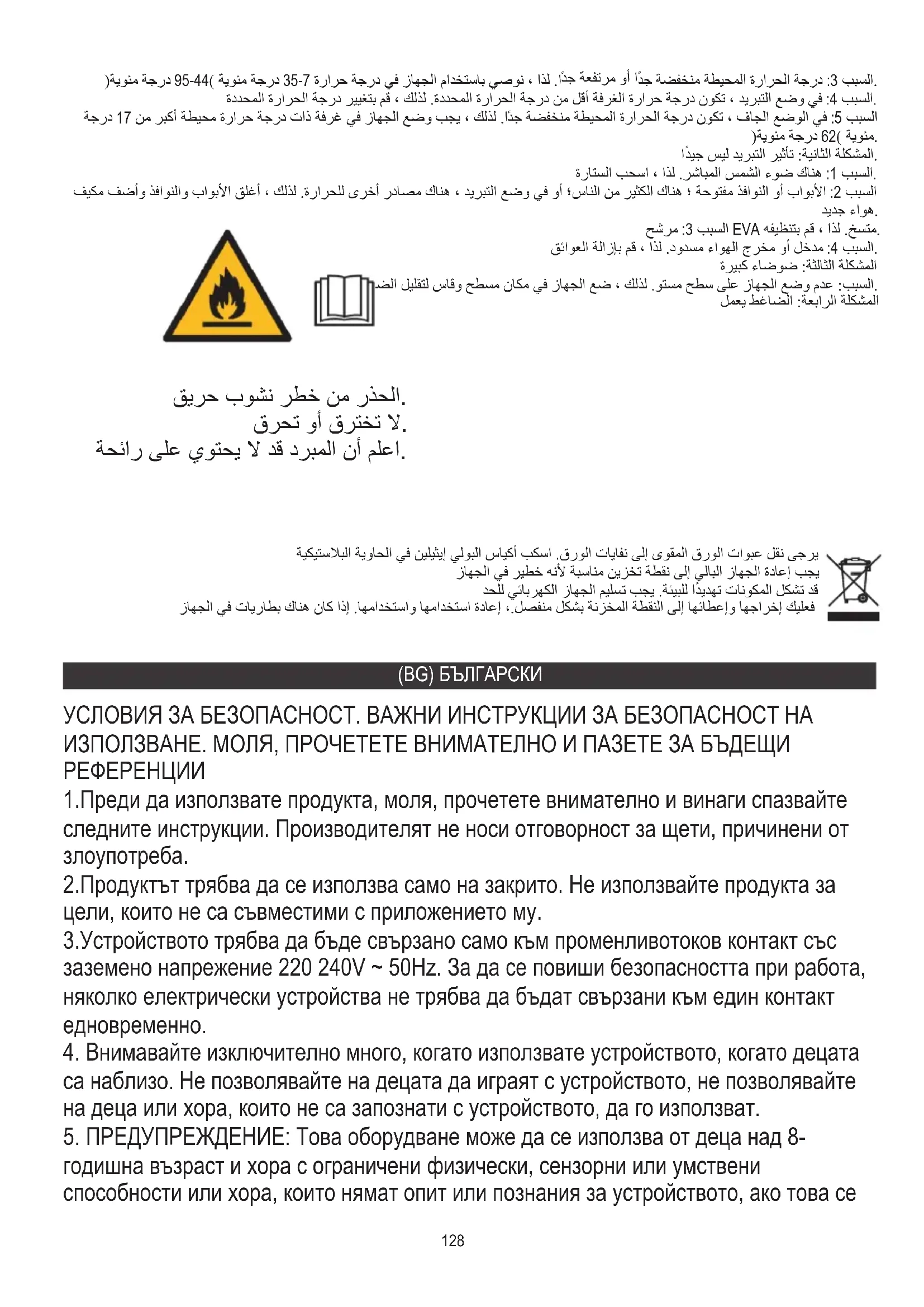 2.Продуктът трябва да се използва само на закрито. Не използвайте продукта за цели, които не са съвместими с приложението му. (BG) БЪЛГАРСКИ10. Поставете устройството на хладна, стабилна повърхност, далеч от горещи кухненски уреди като: електрическа печка, газови котлони и др. прави под наблюдението на отговорно лице за тяхната безопасност или им е била предоставена информация за безопасното използване на устройството и са наясно с опасностите от използването му. Децата не трябва да играят с оборудването. Почистването и поддръжката на устройството не трябва да се извършва от деца, освен ако са на възраст над 8 години и тези дейности се извършват под наблюдение.