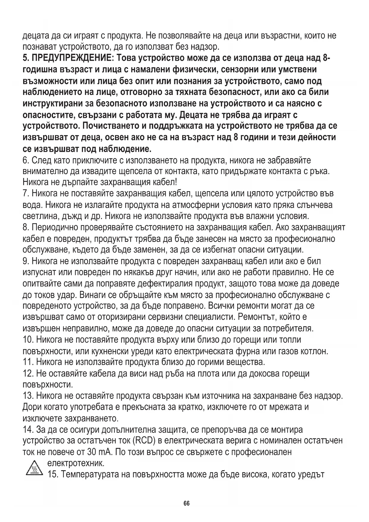 годишна възраст и лица с намалени физически, сензорни или умствени възможности или лица без опит или познания за устройството, само под наблюдението на лице, отговорно за тяхната безопасност, или ако са били инструктирани за безопасното използване на устройството и са наясно с опасностите, свързани с работата му. Децата не трябва да играят с устройството. Почистването и поддръжката на устройството не трябва да се извършват от деца, освен ако не са на възраст над 8 години и тези дейности се извършват под наблюдение.