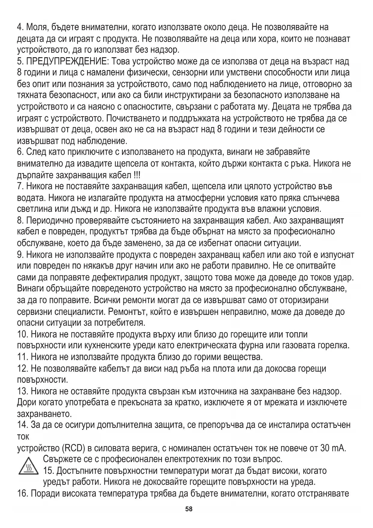 8 години и лица с намалени физически, сензорни или умствени способности или лица без опит или познания за устройството, само под наблюдението на лице, отговорно за тяхната безопасност, или ако са били инструктирани за безопасното използване на устройството и са наясно с опасностите, свързани с работата му. Децата не трябва да играят с устройството. Почистването и поддръжката на устройството не трябва да се извършват от деца, освен ако не са на възраст над 8 години и тези дейности се извършват под наблюдение.