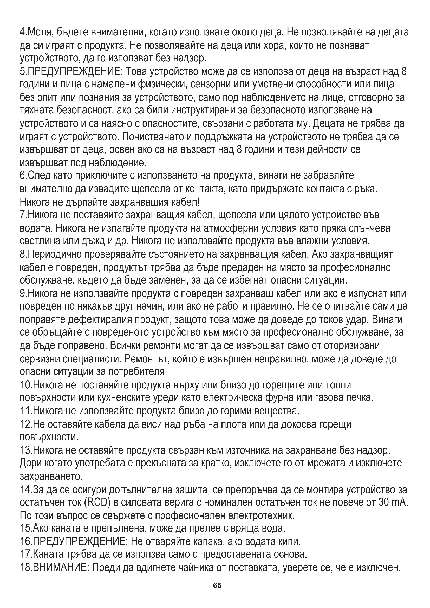 Гаранционните условия са различни, ако устройството се използва с търговска цел." 1.Преди да използвате продукта, моля, прочетете внимателно и винаги спазвайте следните инструкции. Производителят не носи отговорност за щети, причинени от злоупотреба. 2.Продуктът трябва да се използва само на закрито. Не използвайте продукта за цели, които не са съвместими с приложението му. (BG) БЪЛГАРСКИ65 7.Никога не поставяйте захранващия кабел, щепсела или цялото устройство във водата. Никога не излагайте продукта на атмосферни условия като пряка слънчева светлина или дъжд и др. Никога не използвайте продукта във влажни условия. 14.За да се осигури допълнителна защита, се препоръчва да се монтира устройство за остатъчен ток (RCD) в силовата верига с номинален остатъчен ток не повече от 30 mA. По този въпрос се свържете с професионален електротехник. 13.Никога не оставяйте продукта свързан към източника на захранване без надзор. Дори когато употребата е прекъсната за кратко, изключете го от мрежата и изключете захранването. 6.След като приключите с използването на продукта, винаги не забравяйте внимателно да извадите щепсела от контакта, като придържате контакта с ръка. Никога не дърпайте захранващия кабел! 10.Никога не поставяйте продукта върху или близо до горещите или топли повърхности или кухненските уреди като електрическа фурна или газова печка. 5.ПРЕДУПРЕЖДЕНИЕ: Това устройство може да се използва от деца на възраст над 8 години и лица с намалени физически, сензорни или умствени способности или лица без опит или познания за устройството, само под наблюдението на лице, отговорно за тяхната безопасност, ако са били инструктирани за безопасното използване на устройството и са наясно с опасностите, свързани с работата му. Децата не трябва да играят с устройството. Почистването и поддръжката на устройството не трябва да се извършват от деца, освен ако са на възраст над 8 години и тези дейности се извършват под наблюдение. 11.Никога не използвайте продукта близо до горими вещества. 8.Периодично проверявайте състоянието на захранващия кабел. Ако захранващият кабел е повреден, продуктът трябва да бъде предаден на място за професионално обслужване, където да бъде заменен, за да се избегнат опасни ситуации. 18.ВНИМАНИЕ: Преди да вдигнете чайника от поставката, уверете се, че е изключен. 9.Никога не използвайте продукта с повреден захранващ кабел или ако е изпуснат или повреден по някакъв друг начин, или ако не работи правилно. Не се опитвайте сами да поправяте дефектиралия продукт, защото това може да доведе до токов удар. Винаги се обръщайте с повреденото устройство към място за професионално обслужване, за да бъде поправено. Всички ремонти могат да се извършват само от оторизирани сервизни специалисти. Ремонтът, който е извършен неправилно, може да доведе до опасни ситуации за потребителя. 16.ПРЕДУПРЕЖДЕНИЕ: Не отваряйте капака, ако водата кипи. 17.Каната трябва да се използва само с предоставената основа. 15.Ако каната е препълнена, може да прелее с вряща вода. 12.Не оставяйте кабела да виси над ръба на плота или да докосва горещи повърхности. 4.Моля, бъдете внимателни, когато използвате около деца. Не позволявайте на децата да си играят с продукта. Не позволявайте на деца или хора, които не познават устройството, да го използват без надзор.66