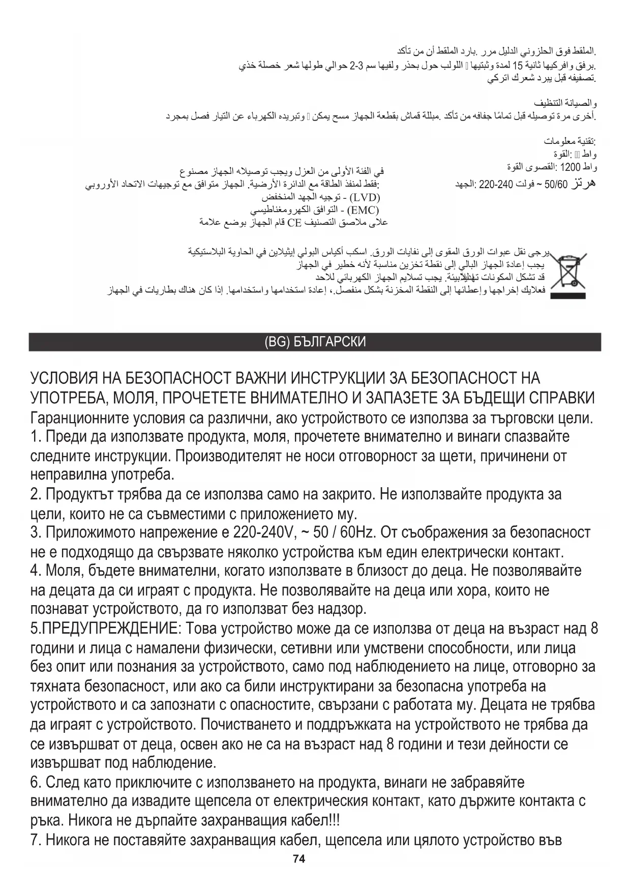 цели, които не са съвместими с приложението му. 5.ПРЕДУПРЕЖДЕНИЕ: Това устройство може да се използва от деца на възраст над 8 години и лица с намалени физически, сетивни или умствени способности, или лица без опит или познания за устройството, само под наблюдението на лице, отговорно за тяхната безопасност, или ако са били инструктирани за безопасна употреба на устройството и са запознати с опасностите, свързани с работата му. Децата не трябва да играят с устройството. Почистването и поддръжката на устройството не трябва да се извършват от деца, освен ако не са на възраст над 8 години и тези дейности се извършват под наблюдение. УСЛОВИЯ НА БЕЗОПАСНОСТ ВАЖНИ ИНСТРУКЦИИ ЗА БЕЗОПАСНОСТ НА УПОТРЕБА, МОЛЯ, ПРОЧЕТЕТЕ ВНИМАТЕЛНО И ЗАПАЗЕТЕ ЗА БЪДЕЩИ СПРАВКИ75 водата. Никога не излагайте продукта на атмосферни условия като пряка слънчева светлина или дъжд и др.. Никога не използвайте продукта във влажни условия.