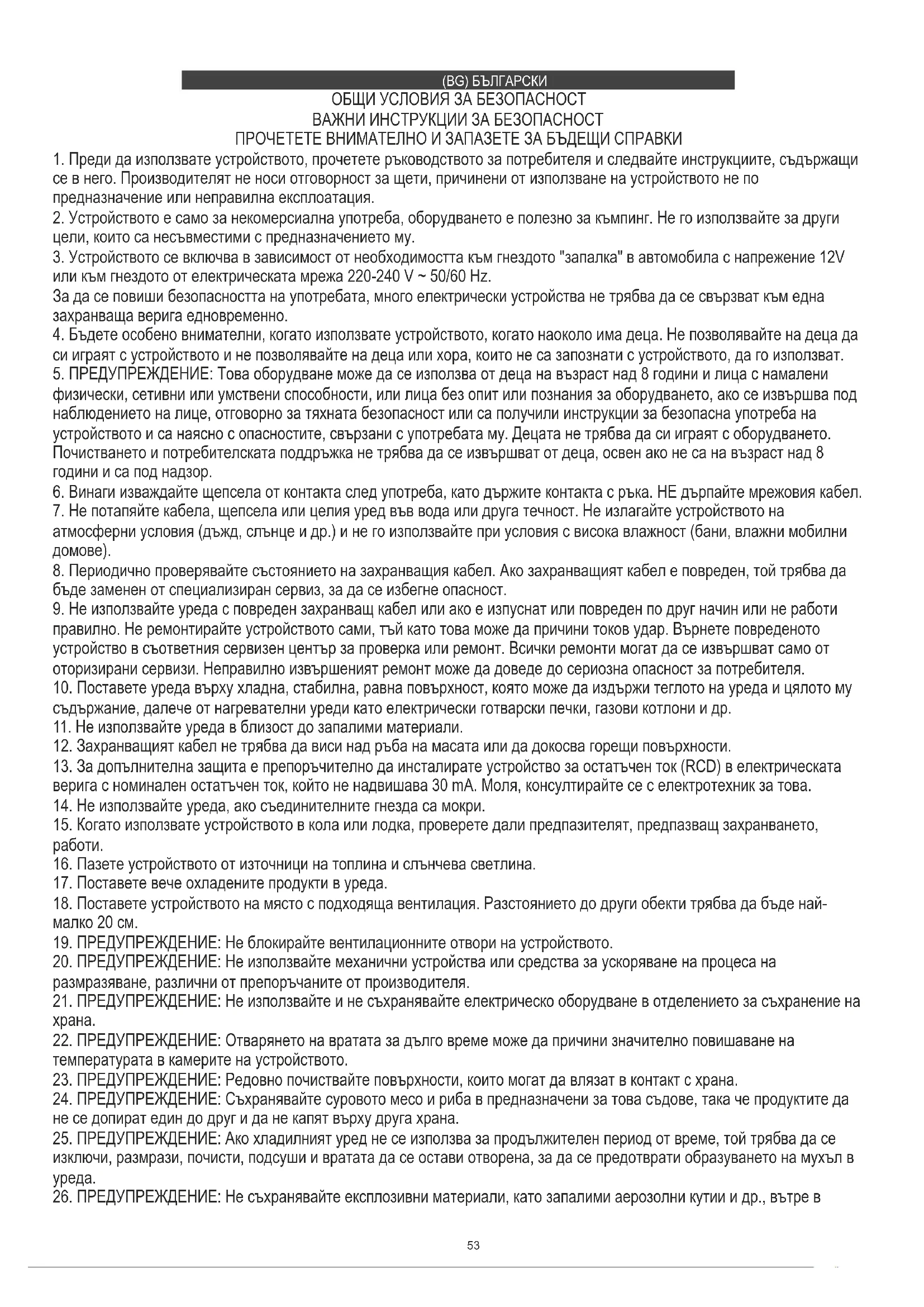 Предупреждение: НЕ ПОСТАВЯЙТЕ ЧУЖДИ ПРЕДМЕТИ ВЪВ ВЕНТИЛАЦИОННИТЕ ОТВОРИ, ЗА ДА СЕ ОПИТВАТЕ И ГИ ПОЧИСТИТЕ. ТЕХНИЧЕСКИ ДАННИ Основно захранване: Напрежение 220-240V ~50/60Hz, Консумирана мощност: Режим на охлаждане: 55W / Режим на отопление: 50W Климатичен клас: SN/N Захранване за автомобил: Напрежение 12V DC, Консумирана мощност: Режим на охлаждане: 45W / Режим на отопление: 40W Капацитет: 28 литра Моля, прехвърлете картонените опаковки в отпадъчна хартия. Изсипете полиетиленовите торбички (PE) в пластмасовия контейнер. Износеното устройство трябва да се върне в съответното място за съхранение, тъй като е опасно в устройството съставките могат да представляват заплаха за околната среда. Електрическото устройство трябва да бъде предадено докрай повторното му използване и използване. Ако в устройството има батерии, трябва да извадите и да дадете на точката, съхранявана отделно.55