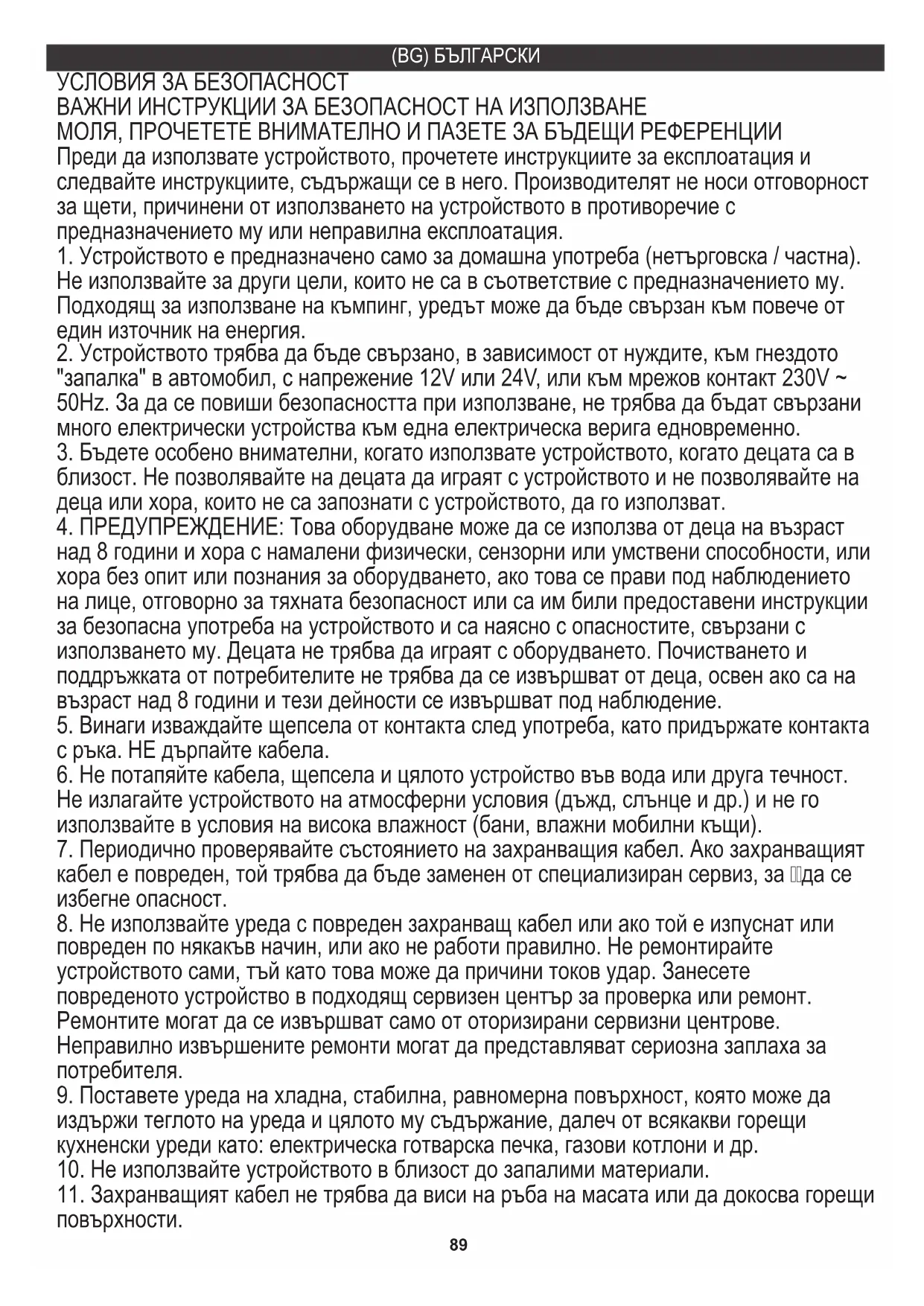 "запалка" в автомобил, с напрежение 12V или 24V, или към мрежов контакт 230V ~ 50Hz. За да се повиши безопасността при използване, не трябва да бъдат свързани много електрически устройства към една електрическа верига едновременно.