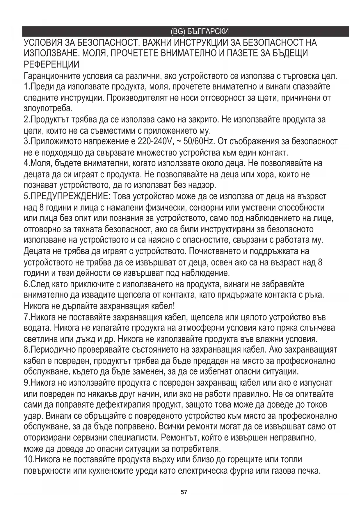1.Преди да използвате продукта, моля, прочетете внимателно и винаги спазвайте следните инструкции. Производителят не носи отговорност за щети, причинени от злоупотреба. 5.ПРЕДУПРЕЖДЕНИЕ: Това устройство може да се използва от деца на възраст над 8 години и лица с намалени физически, сензорни или умствени способности или лица без опит или познания за устройството, само под наблюдението на лице, отговорно за тяхната безопасност, ако са били инструктирани за безопасното използване на устройството и са наясно с опасностите, свързани с работата му. Децата не трябва да играят с устройството. Почистването и поддръжката на устройството не трябва да се извършват от деца, освен ако са на възраст над 8 години и тези дейности се извършват под наблюдение. 9.Никога не използвайте продукта с повреден захранващ кабел или ако е изпуснат или повреден по някакъв друг начин, или ако не работи правилно. Не се опитвайте сами да поправяте дефектиралия продукт, защото това може да доведе до токов удар. Винаги се обръщайте с повреденото устройство към място за професионално обслужване, за да бъде поправено. Всички ремонти могат да се извършват само от оторизирани сервизни специалисти. Ремонтът, който е извършен неправилно, може да доведе до опасни ситуации за потребителя. 7.Никога не поставяйте захранващия кабел, щепсела или цялото устройство във водата. Никога не излагайте продукта на атмосферни условия като пряка слънчева светлина или дъжд и др. Никога не използвайте продукта във влажни условия. 6.След като приключите с използването на продукта, винаги не забравяйте внимателно да извадите щепсела от контакта, като придържате контакта с ръка. Никога не дърпайте захранващия кабел! Гаранционните условия са различни, ако устройството се използва с търговска цел. 10.Никога не поставяйте продукта върху или близо до горещите или топли повърхности или кухненските уреди като електрическа фурна или газова печка. 2.Продуктът трябва да се използва само на закрито. Не използвайте продукта за цели, които не са съвместими с приложението му.58 18.ВНИМАНИЕ: Преди да вдигнете каната от поставката, уверете се, че е