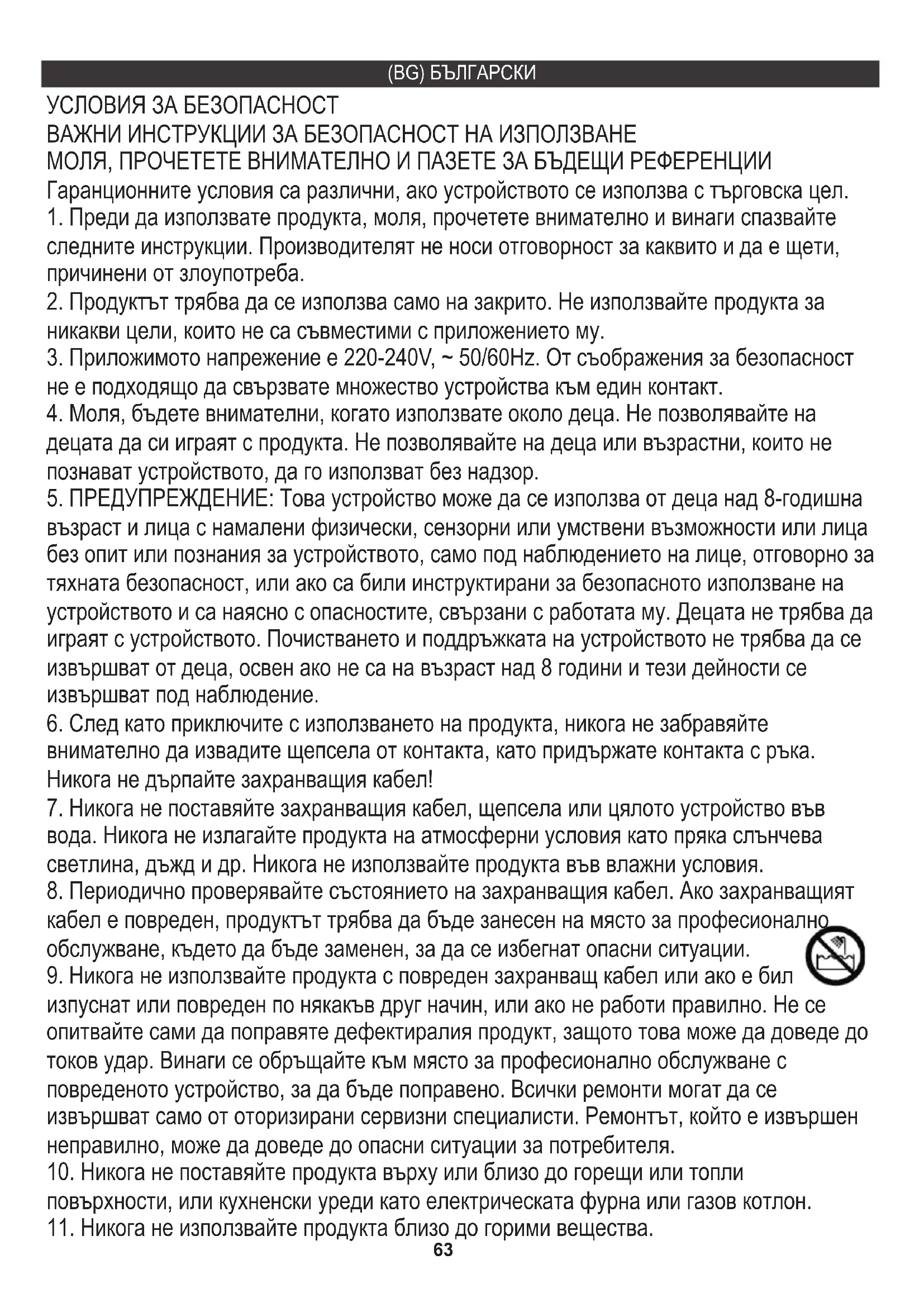 възраст и лица с намалени физически, сензорни или умствени възможности или лица без опит или познания за устройството, само под наблюдението на лице, отговорно за тяхната безопасност, или ако са били инструктирани за безопасното използване на устройството и са наясно с опасностите, свързани с работата му. Децата не трябва да играят с устройството. Почистването и поддръжката на устройството не трябва да се извършват от деца, освен ако не са на възраст над 8 години и тези дейности се извършват под наблюдение. ВАЖНИ ИНСТРУКЦИИ ЗА БЕЗОПАСНОСТ НА ИЗПОЛЗВАНЕ Гаранционните условия са различни, ако устройството се използва с търговска цел. (BG) БЪЛГАРСКИ64