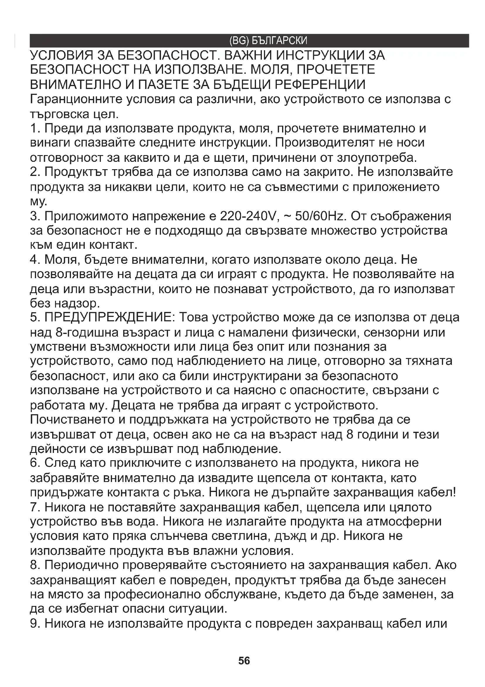 забравяйте внимателно да извадите щепсела от контакта, като придържате контакта с ръка. Никога не дърпайте захранващия кабел! УСЛОВИЯ ЗА БЕЗОПАСНОСТ. ВАЖНИ ИНСТРУКЦИИ ЗА БЕЗОПАСНОСТ НА ИЗПОЛЗВАНЕ. МОЛЯ, ПРОЧЕТЕТЕ ВНИМАТЕЛНО И ПАЗЕТЕ ЗА БЪДЕЩИ РЕФЕРЕНЦИИ (BG) БЪЛГАРСКИ57