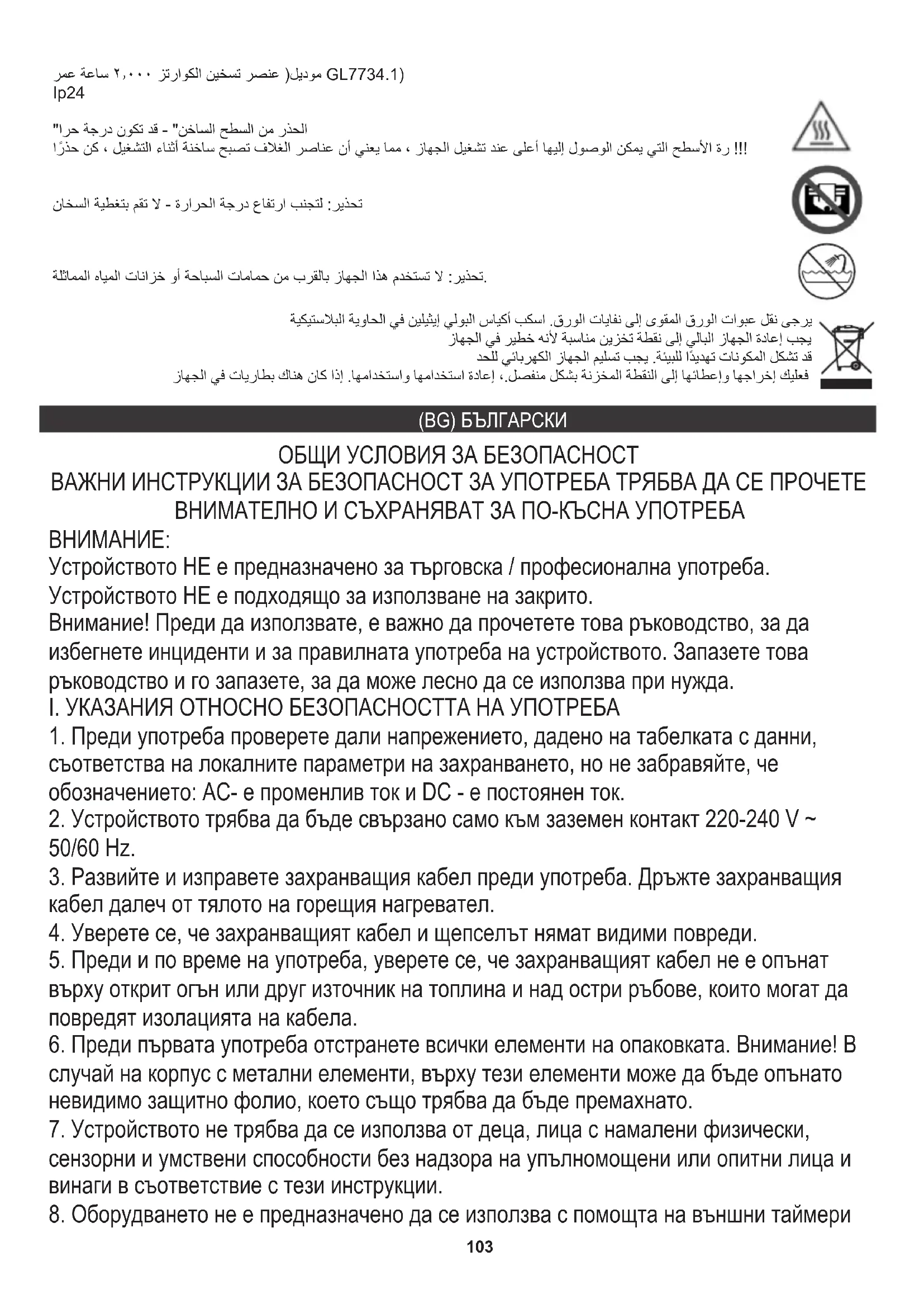 малки винта (B1) и внимателно повдигане. Използвайте мека четка, за да отстраните внимателно праха и отломките. Никога не използвайте компресор, тъй като това може да повреди лампите или рефлектора. Сменете решетката и я закрепете. ТЕХНИЧЕСКИ ДАННИ Мощност: 2000W Захранване: 220-240 ~ 50Hz Кварцов нагревателен елемент 2.000 часа живот (модел GL7734.1) IP24 "Внимание Гореща повърхност" - Температурата на достъпните повърхности може да бъде по-висока, когато оборудването работи, което означава, че елементите на корпуса се нагряват по време на работа по време на работа, ВНИМАТЕЛНО !!! ПРЕДУПРЕЖДЕНИЕ: За да избегнете прегряване - не покривайте нагревателя ПРЕДУПРЕЖДЕНИЕ: Не използвайте това оборудване в близост до басейни или подобни резервоари за вода. Моля, прехвърлете картонените опаковки в отпадъчна хартия. Изсипете полиетиленовите торбички (PE) в пластмасовия контейнер. Износеното устройство трябва да се върне в съответното място за съхранение, тъй като е опасно в устройството съставките могат да представляват заплаха за околната среда. Електрическото устройство трябва да бъде предадено докрай повторното му използване и използване. Ако в устройството има батерии, трябва да извадите и да дадете на точката, съхранявана отделно.
