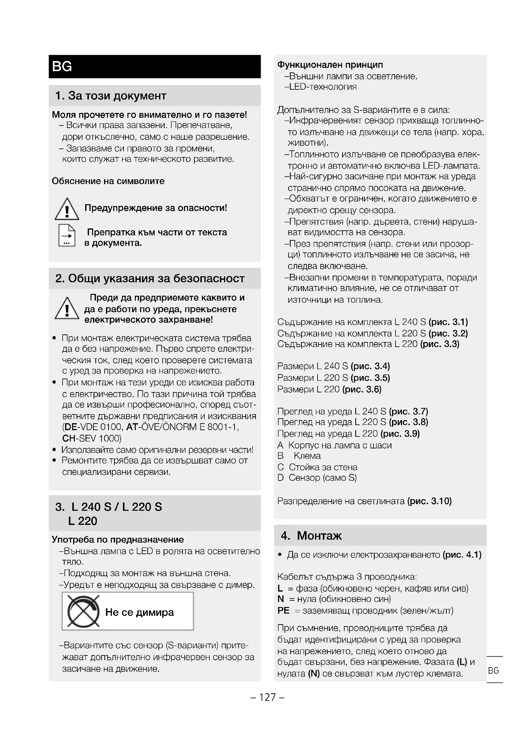 – Топлинното излъчване се преобразува елек- тронно и автоматично включва LED-лампата. – Най-сигурно засичане при монтаж на уреда странично спрямо посоката на движение. – Обхватът е ограничен, когато движението е директно срещу сензора. – Препятствия (напр. дървета, стени) наруша- ват видимостта на сензора. – През препятствия (напр. стени или прозор- ци) топлинното излъчване не се засича, не следва включване. – Внезапни промени в температурата, поради климатично влияние, не се отличават от източници на топлина. Съдържание на комплекта L 240 S (рис. 3.1) Съдържание на комплекта L 220 S (рис. 3.2) Съдържание на комплекта L 220 (рис. 3.3) Размери L 240 S (рис. 3.4) Размери L 220 S (рис. 3.5) Размери L 220 (рис. 3.6) Преглед на уреда L 240 S (рис. 3.7) Преглед на уреда L 220 S (рис. 3.8) Преглед на уреда L 220 (рис. 3.9) A Корпус на лампа с шаси B Клема C Стойка за стена D Сензор (само S) Разпределение на светлината (рис. 3.10)