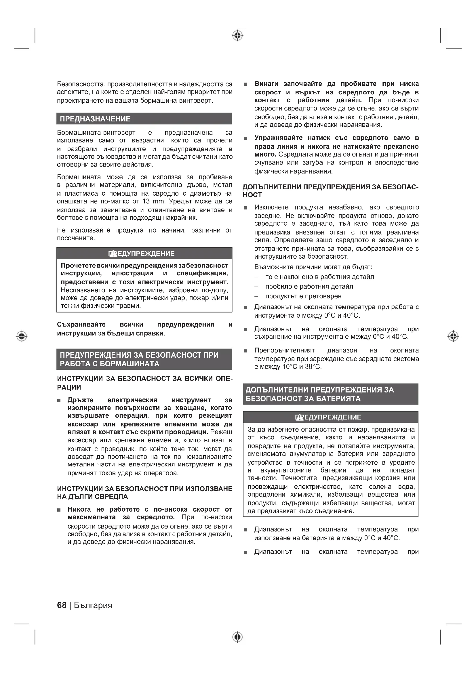 ■ Изключете продукта незабавно, ако свредлото заседне. Не включвайте продукта отново, докато свредлото е заседнало, тъй като това може да предизвика внезапен откат с голяма реактивна сила. Определете защо свредлото е заседнало и отстранете причината за това, съобразявайки се с инструкциите за безопасност. Възможните причини могат да бъдат: – то е наклонено в работния детайл – пробило е работния детайл – продуктът е претоварен ■ Диапазонът на околната температура при работа с инструмента е между 0°C и 40°C. ■ Диапазонът на околната температура при съхранение на инструмента е между 0°C и 40°C. ■ Препоръчителният диапазон на околната температура при зареждане със зарядната система е между 10°C и 38°C. ДОПЪЛНИТЕЛНИ ПРЕДУПРЕЖДЕНИЯ ЗА БЕЗОПАСНОСТ ЗА БАТЕРИЯТА ПРЕДУПРЕЖДЕНИЕ За да избегнете опасността от пожар, предизвикана от късо съединение, както и нараняванията и повредите на продукта, не потапяйте инструмента, сменяемата акумулаторна батерия или зарядното устройство в течности и се погрижете в уредите и акумулаторните батерии да не попадат течности. Течностите, предизвикващи корозия или провеждащи електричество, като солена вода, определени химикали, избелващи вещества или продукти, съдържащи избелващи вещества, могат да предизвикат късо съединение. ■ Диапазонът на околната температура при използване на батерията е между 0°C и 40°C. ■ Диапазонът на околната температура при69 България |