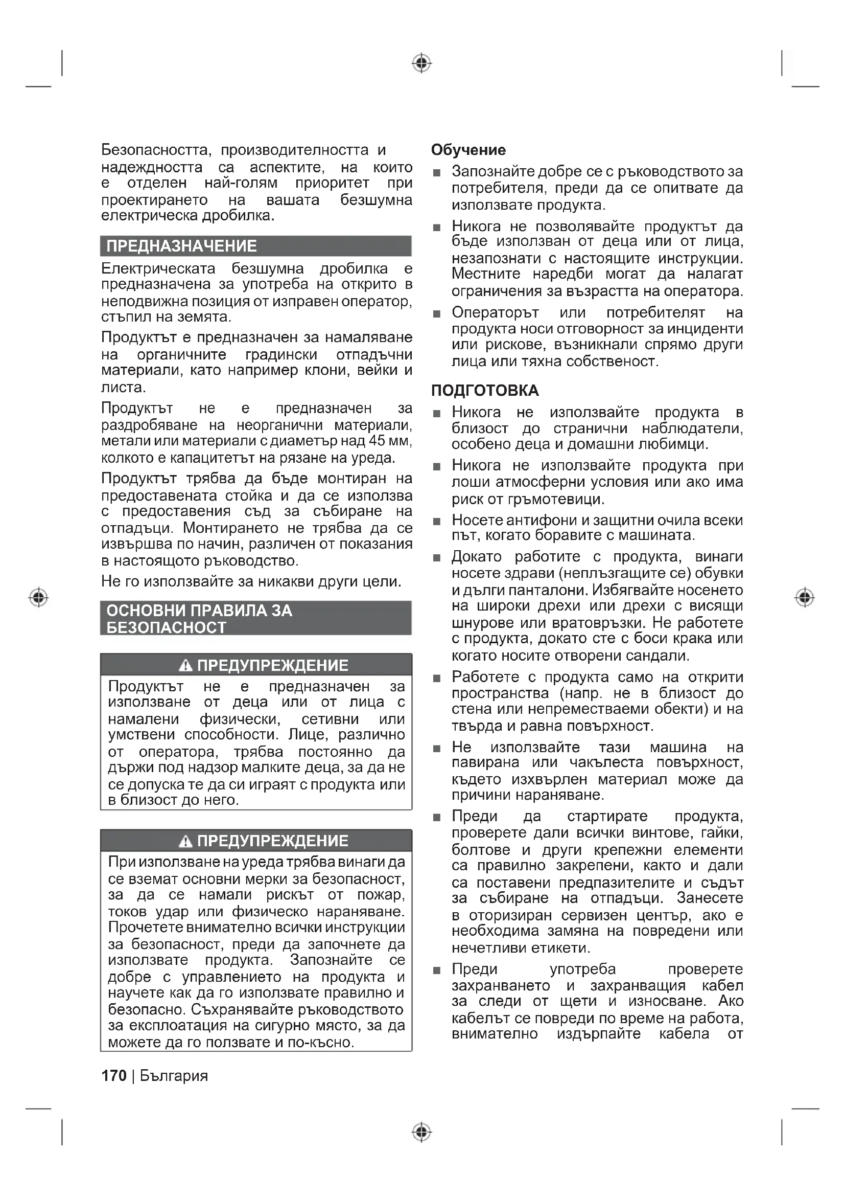 електричеството. Не докосвайте кабела, преди да изключите захранването. Не използвайте инструмента, ако кабелът е повреден или износен. ЕЛЕКТРИЧЕСКА БЕЗОПАСНОСТ ■ Прочетете внимателно настоящите инструкции, преди да свържете продукта към електрическата мрежа. ■ Преди включване се уверете, че напрежението на електрическата мрежа съвпада с посоченото на табелката с номинални стойности. Производителят препоръчва да свържете към захранващо гнездо, защитено с диференциалнотокова защита с максимален ток на изключване 30 mA. ■ Свързването му към какъвто и да е друг захранващ източник може да го повреди. ■ Ако захранващият кабел е повреден, трябва да бъде сменен от производителя, негов сервизен представител или подобно квалифицирано лице, за да се избегнат опасностите. ■ Ако е необходимо да използвате удължаващ кабел, проверете дали той е подходящ за работа на открито или дали захранващият му капацитет е достатъчен за захранване на вашия инструмент. Удължаващият кабел трябва да има маркировка „H05 RN-F” или „H05 VV-F”. Преди всяко използване проверявайте кабела за повреди, а при работа винаги го развивайте, защото неразвитите кабели могат да прегреят. Повредените удължителни кабели не трябва да се поправят, а да се сменят с такива от еквивалентен тип. ■ Дръжте удължаващите кабели далеч от движещите се опасни части, за да избегнете повреди на кабелите, което може да доведе до контакт с електризирани компоненти. ПРЕДУПРЕЖДЕНИЯ ЗА БЕЗОПАСНОСТ ПРИ РАБОТА С ДРОБИЛКАТА
