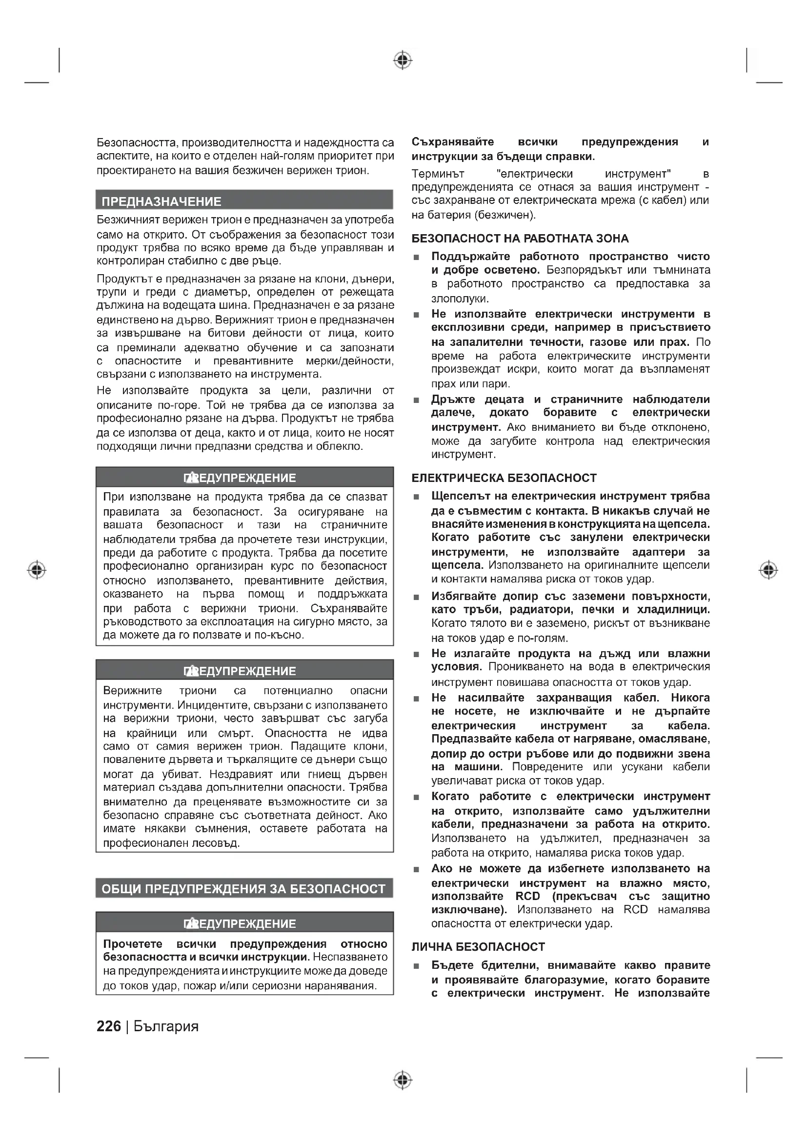 ■ Не използвайте електрически инструменти в експлозивни среди, например в присъствието на запалителни течности, газове или прах. По време на работа електрическите инструменти произвеждат искри, които могат да възпламенят прах или пари. ■ Дръжте децата и страничните наблюдатели далече, докато боравите с електрически инструмент. Ако вниманието ви бъде отклонено, може да загубите контрола над електрическия инструмент. ЕЛЕКТРИЧЕСКА БЕЗОПАСНОСТ ■ Щепселът на електрическия инструмент трябва да е съвместим с контакта. В никакъв случай не внасяйте изменения в конструкцията на щепсела. Когато работите със занулени електрически инструменти, не използвайте адаптери за щепсела. Използването на оригиналните щепсели и контакти намалява риска от токов удар. ■ Избягвайте допир със заземени повърхности, като тръби, радиатори, печки и хладилници. Когато тялото ви е заземено, рискът от възникване на токов удар е по-голям. ■ Не излагайте продукта на дъжд или влажни условия. Проникването на вода в електрическия инструмент повишава опасността от токов удар. ■ Не насилвайте захранващия кабел. Никога не носете, не изключвайте и не дърпайте електрическия инструмент за кабела. Предпазвайте кабела от нагряване, омасляване, допир до остри ръбове или до подвижни звена на машини. Повредените или усукани кабели увеличават риска от токов удар. ■ Когато работите с електрически инструмент на открито, използвайте само удължителни кабели, предназначени за работа на открито. Използването на удължител, предназначен за работа на открито, намалява риска токов удар. ■ Ако не можете да избегнете използването на електрически инструмент на влажно място, използвайте RCD (прекъсвач със защитно изключване). Използването на RCD намалява опасността от електрически удар. ЛИЧНА БЕЗОПАСНОСТ ■ Бъдете бдителни, внимавайте какво правите и проявявайте благоразумие, когато боравите с електрически инструмент. Не използвайте227 България |