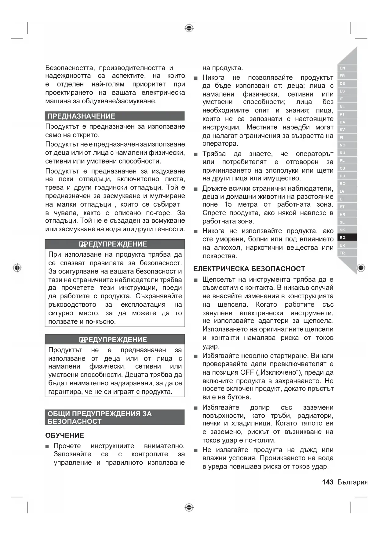Безопасността, производителността и надеждността са аспектите, на които е отделен най-голям приоритет при проектирането на вашата електрическа машина за обдухване/засмукване. ПРЕДНАЗНАЧЕНИЕ Продуктът е предназначен за използване само на открито. Продуктът не е предназначен за използване от деца или от лица с намалени физически, сетивни или умствени способности. Продуктът е предназначен за издухване на леки отпадъци, включително листа, трева и други градински отпадъци. Той е предназначен за засмукване и мулчиране на малки отпадъци , които се събират в чувала, както е описано по-горе. За отпадъци. Той не е създаден за всмукване или засмукване на вода или други течности. ПРЕДУПРЕЖДЕНИЕ При използване на продукта трябва да се спазват правилата за безопасност. За осигуряване на вашата безопасност и тази на страничните наблюдатели трябва да прочетете тези инструкции, преди да работите с продукта. Съхранявайте ръководството за експлоатация на сигурно място, за да можете да го ползвате и по-късно. ПРЕДУПРЕЖДЕНИЕ Продуктът не е предназначен за използване от деца или от лица с намалени физически, сетивни или умствени способности. Децата трябва да бъдат внимателно надзиравани, за да се гарантира, че не си играят с продукта. ОБЩИ ПРЕДУПРЕЖДЕНИЯ ЗА БЕЗОПАСНОСТ
