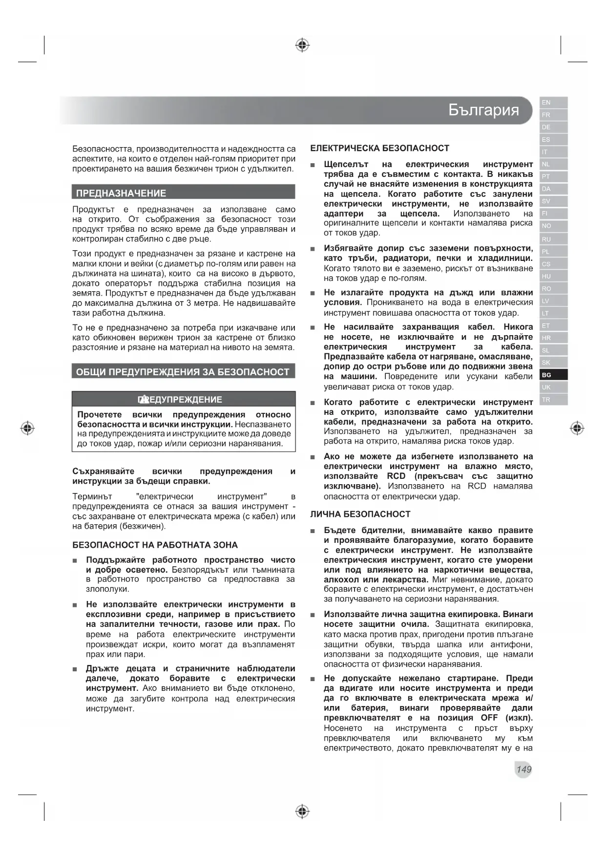■ Не използвайте продукта, когато има условия за възникване на гръмотевични бури или мълнии. Съхранявайте продукта на сигурно и закрито място. ■ Уверете се, че всички предпазители и ръкохватки са поставени на мястото им и са в изправност. ■ Не започвайте работа с продукта, преди да е осигурена чиста работна зона, стабилна опора и планиран път за оттегляне далече от падащите клони и вейки. ■ Внимавайте да не вдишвате пръски от смазочната течност или стърготини. При необходимост носете маска или респиратор. ■ Дръжте продукта с двете ръце, когато работите с него. Хванете здраво предната ръкохватка с едната си ръка. Използвайте другата си ръка, за да хванете задната ръкохватка и да управлявате фиксатора на спусъка, както и спусъка за включване/изключване. ■ Дръжте електрическия инструмент само за изолираните повърхности за хващане, тъй като веригата може да влезе в контакт със скрити кабели. Ако веригата влезе в контакт с открити жици, може да протече ток по металните части на електрическия инструмент, в следствие на което операторът може да претърпи токов удар. ■ Не модифицирайте продукта по никакъв начин и не го използвайте за захранване или задвижване на приставки и устройства, които не са препоръчани от производителя на вашия продукт. ■ Към вашата ножица за жив плет има презрамка. Трябва да го използвате, докато работите с ножицата за жив плет. Това ще ви помогне да контролирате отпускането на ножиците за жив плет, след като разрезът е извършен. Това ще ви помогне също да поддържате тежестта на машината при работа и докато се предвижвате между различни позиции на кастрене. ■ Запознайте се с механизма за бързо освобождаване и упражнявайте използването му, преди да започнете да работите с машината. Правилното използване на този механизъм може да предотврати сериозно нараняване при възникване на извънредна ситуация. Никога не носете допълнително облекло над ремъка за закачане, защото така се блокира достъпът до механизъма за бързо освобождаване. ■ Преди да включите инструмента, се уверете, че веригата не се допира до каквито да е предмети. ■ Неправилно обтегнатата верига може да отскочи от водещата шина, което може да доведе до сериозно нараняване или смърт. Проверявайте изправността периодично и преди всяка употреба, особено след монтиране на нова верига. ■ За да намалите опасността от нараняване приБългария