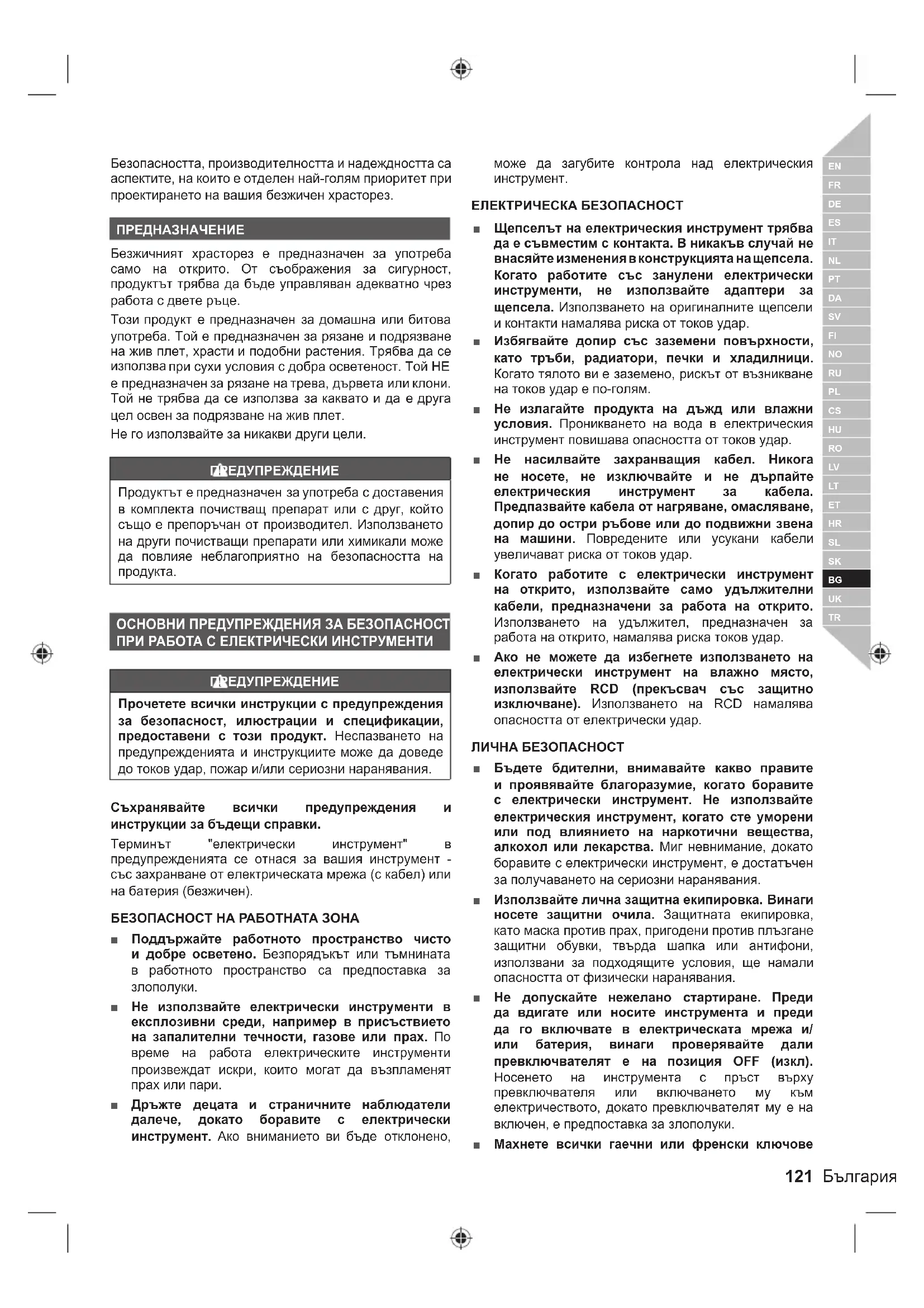 Безопасността, производителността и надеждността са аспектите, на които е отделен най-голям приоритет при проектирането на вашия безжичен храсторез. ПРЕДНАЗНАЧЕНИЕ Безжичният храсторез е предназначен за употреба само на открито. От съображения за сигурност, продуктът трябва да бъде управляван адекватно чрез работа с двете ръце. Този продукт е предназначен за домашна или битова употреба. Той е предназначен за рязане и подрязване на жив плет, храсти и подобни растения. Трябва да се