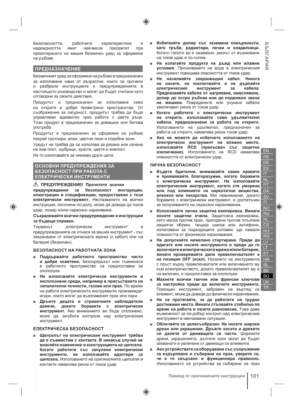 Превод от оригиналните инструкции■ Продуктът не е предназначен за използване от деца или от лица с намалени физически, сетивни или умствени способности. Децата трябва да бъдат внимателно надзиравани, за да се гарантира, че не си играят с продукта. ■ Никога не използвайте инструмента, докато наблизо има хора, особено деца или домашни любимци. ■ Докато оформяте ръбове, винаги носете защитни средства за предпазване на очите и ушите, здрави обувки и дълги панталони. ■ Винаги стъпвайте внимателно и стабилно на стръмни повърхности. ■ Бъдете изключително внимателни, когато обръщате или издърпвате продукта към Вас. ■ В някои региони има разпоредби, ограничаващи използването на продукта до определени операции. За съвети се обръщайте към местните власти. ■ Проверете внимателно повърхността, върху която ще се използва продуктът, и премахнете всички камъни, пръчки, жици, кости и други чужди предмети. ■ Избягвайте да използвате продукта при лоши метеорологични условия, особено ако има риск от